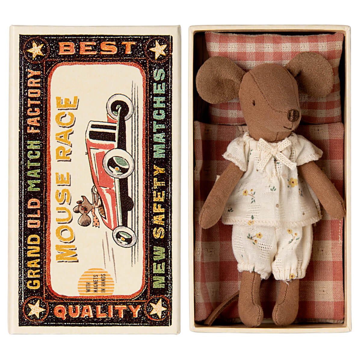 Big Sister mouse in a matchbox by Maileg. A classic Maileg item. This mouse is ready for hours of play and sleeps tight in the matchbox. The clothes and bed linen come in unique prints and beautiful colours.