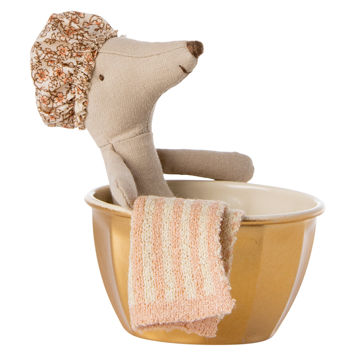 Big Sister Wellness Mouse by Maileg. Like everyone else, this mouse loves to spend hours in the warm water in her lovely bathtub. This playset contains a golden metal bathtub, a big sister mouse, a showercap and a towel.