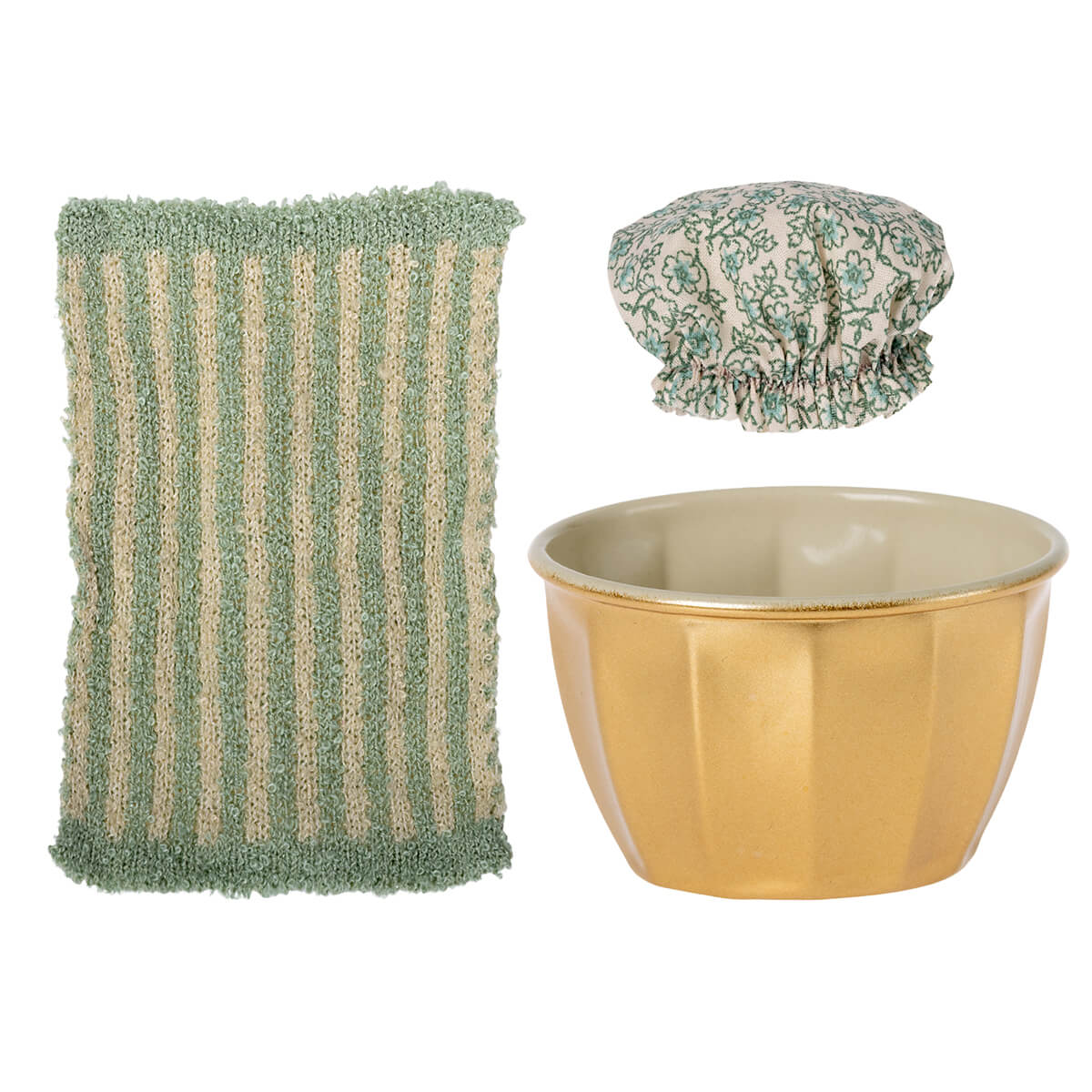 Big sister spa and wellness mouse in a teacup by Maileg.  Rub a Dub Dub there is a mouse in the tub.  Ms. Mouse gets squeaky clean with her sponge and scrubbing brush, but her ears stay dry with her shower cap.  She is a resourceful little lady by using a cute painted metal cup for her bathtub.