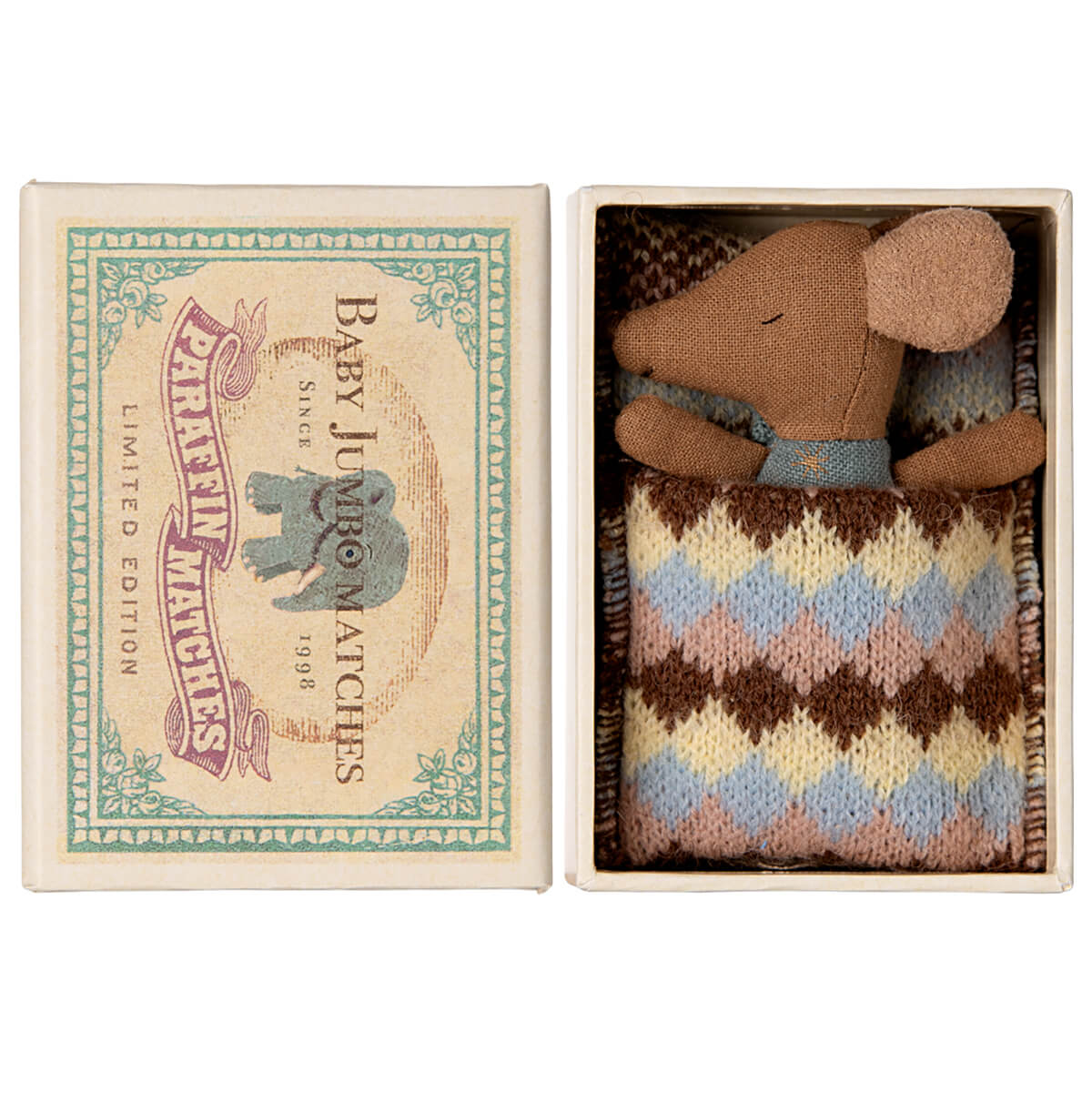 Sleepy / Wakey Baby Mouse In Matchbox by Maileg. A classic Maileg item. This mouse is ready for hours of play and sleeps tight in the little matchbox. The clothes and bedlinen are made of soft fabrics with unique prints and beautiful colors.