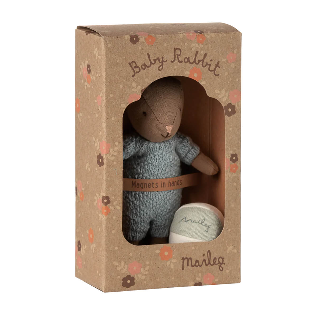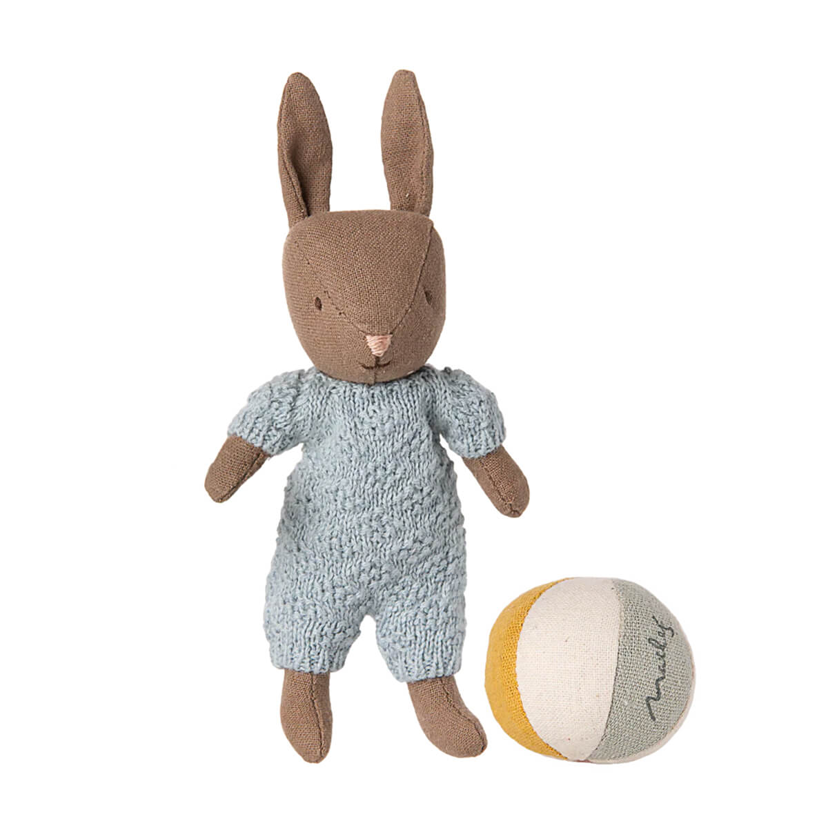 Micro rabbit set by Maileg. The perfect gift set to start hours of storytelling. It contains a small ball and a soft rabbit in size micro with magnets in hands. All fitted nicely together and a great start of any rabbit collection.
