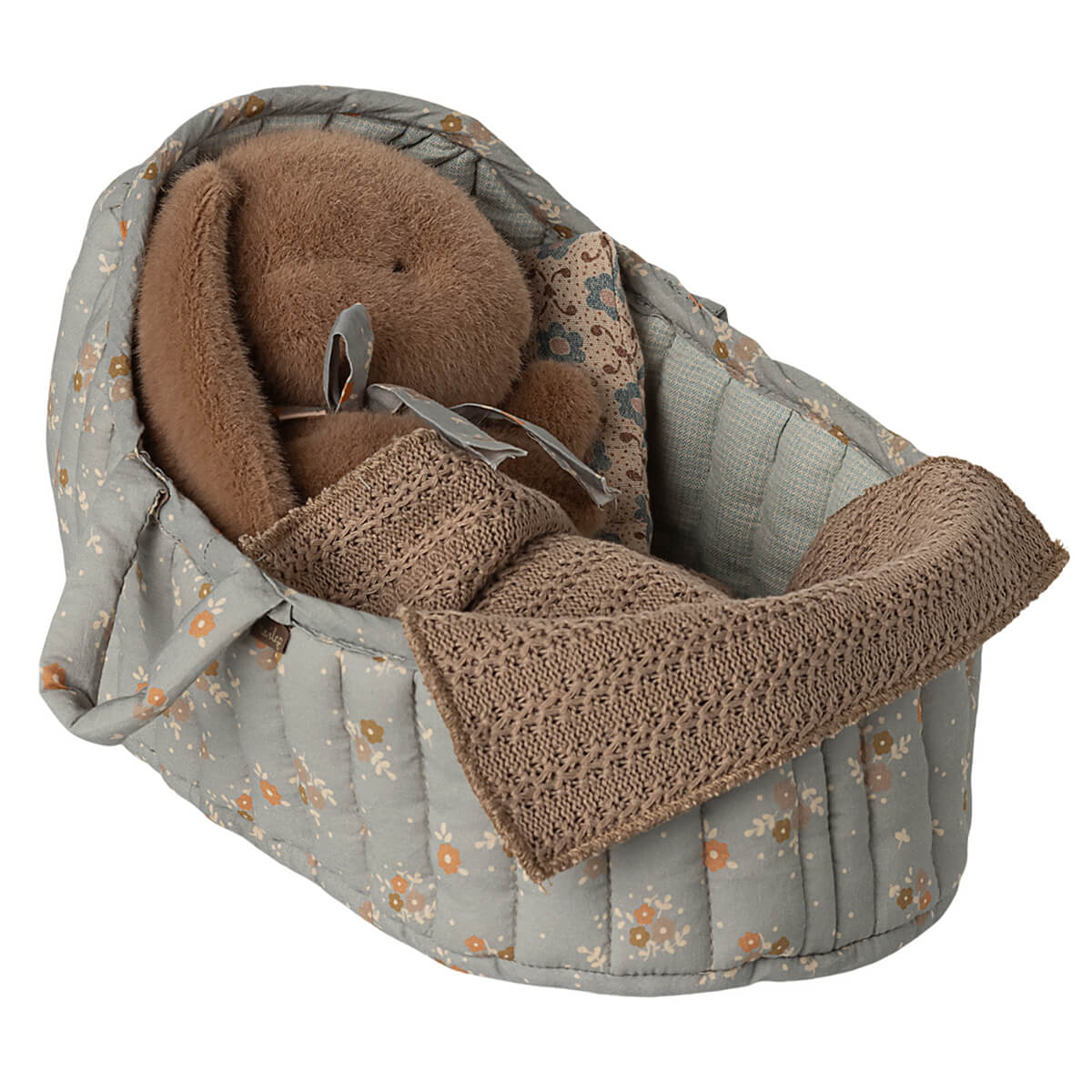 Carry cot for large babies by Maileg.  A small portable bed for your soft friends - Bunny plush and small Safari friends fit perfectly. With this carrycot, it is easy to bring along your friend. Your friend will sleep tight with the soft pillow and under the warm knitted blanket.