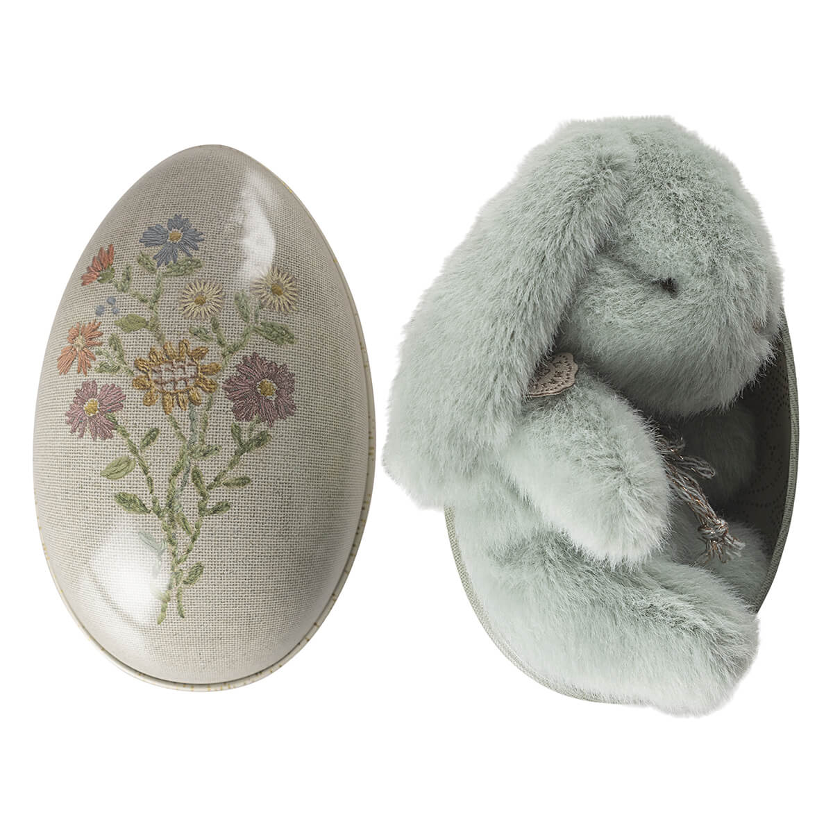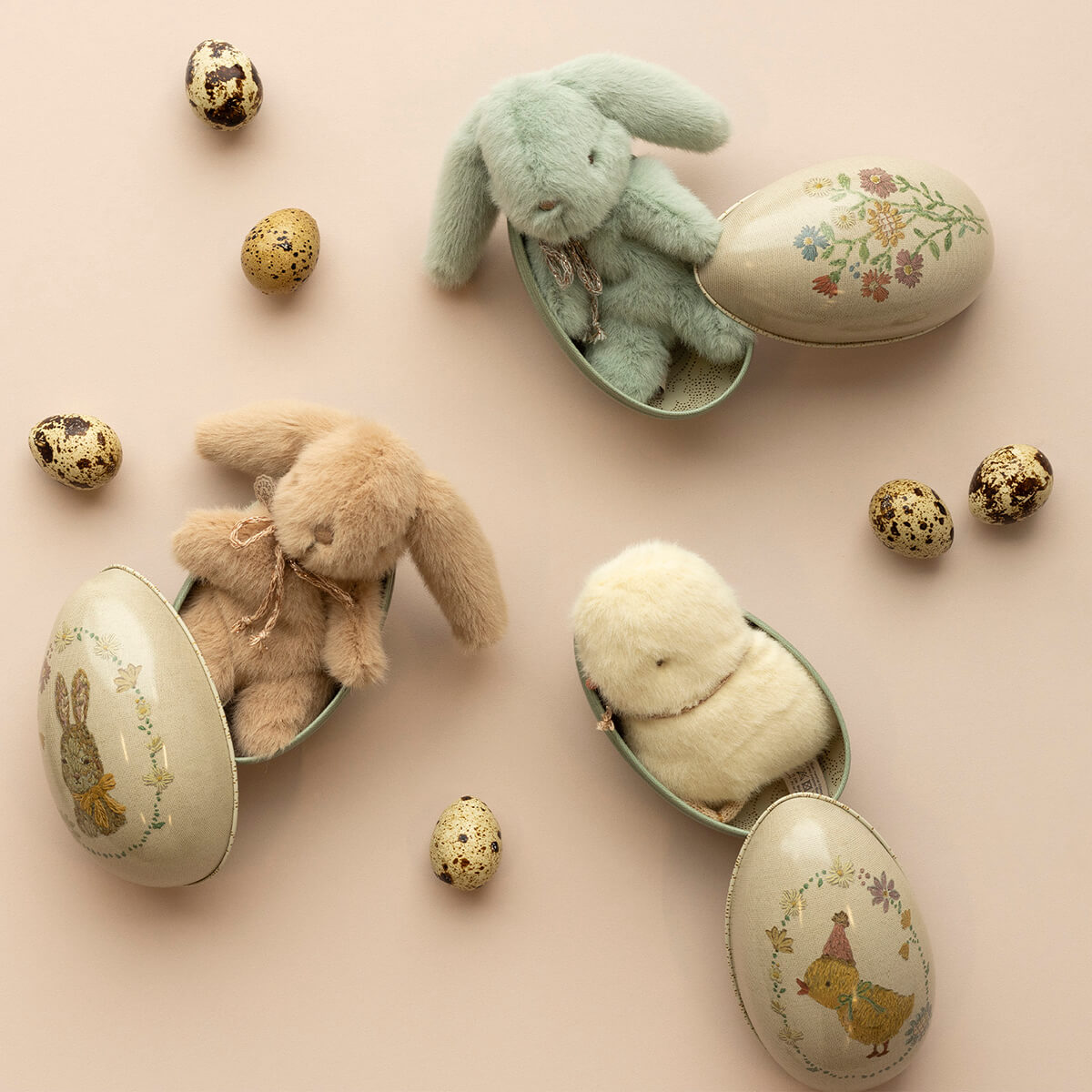 Metal Easter egg and mini plush mint bunny by Maileg. An Easter Egg with a surprise inside! The perfect Easter gift - a sweet Maileg Easter egg tin containing a small plush bunny which is perfect for a tiny hand. The mini sized bunny has the sweetest look and a very soft hand feel.