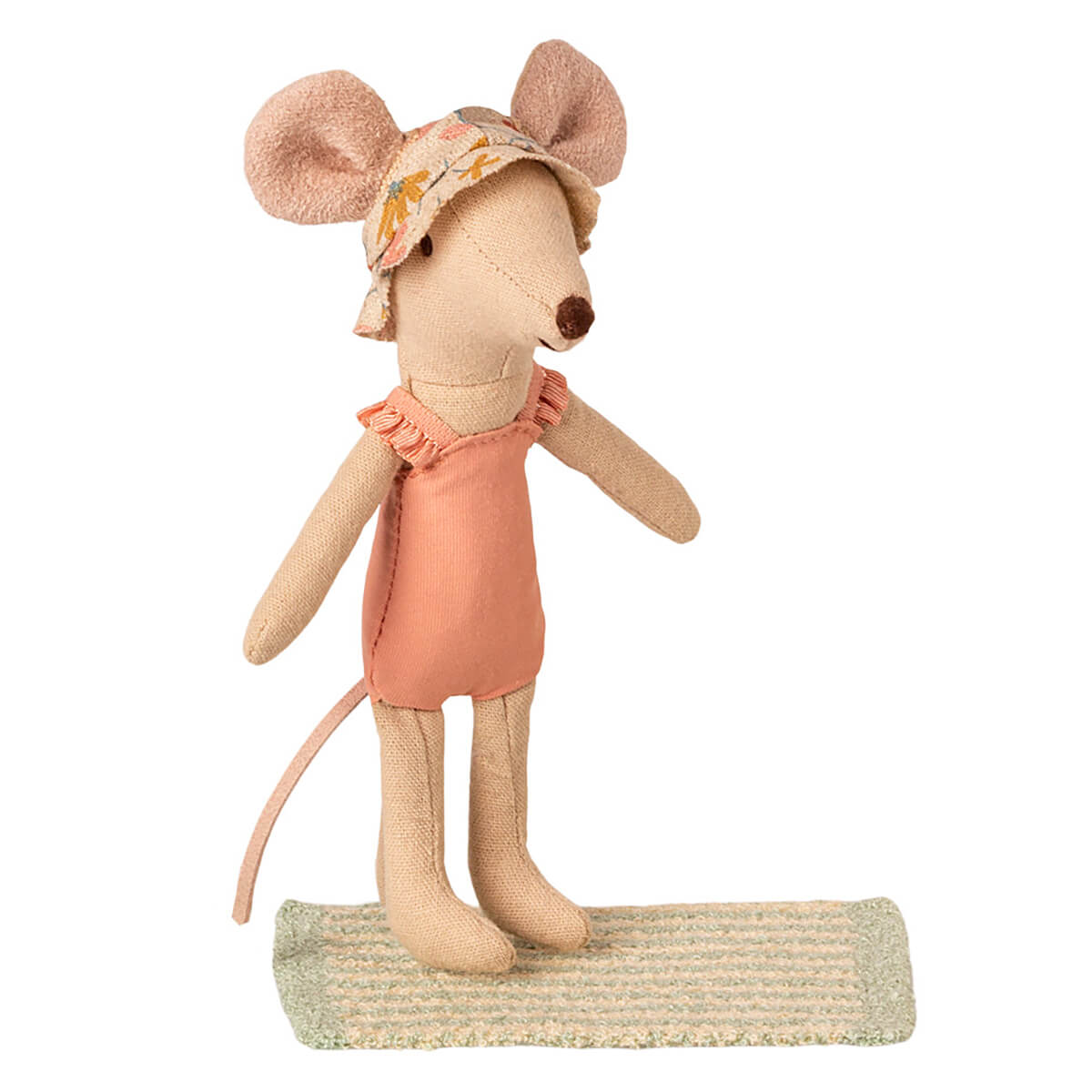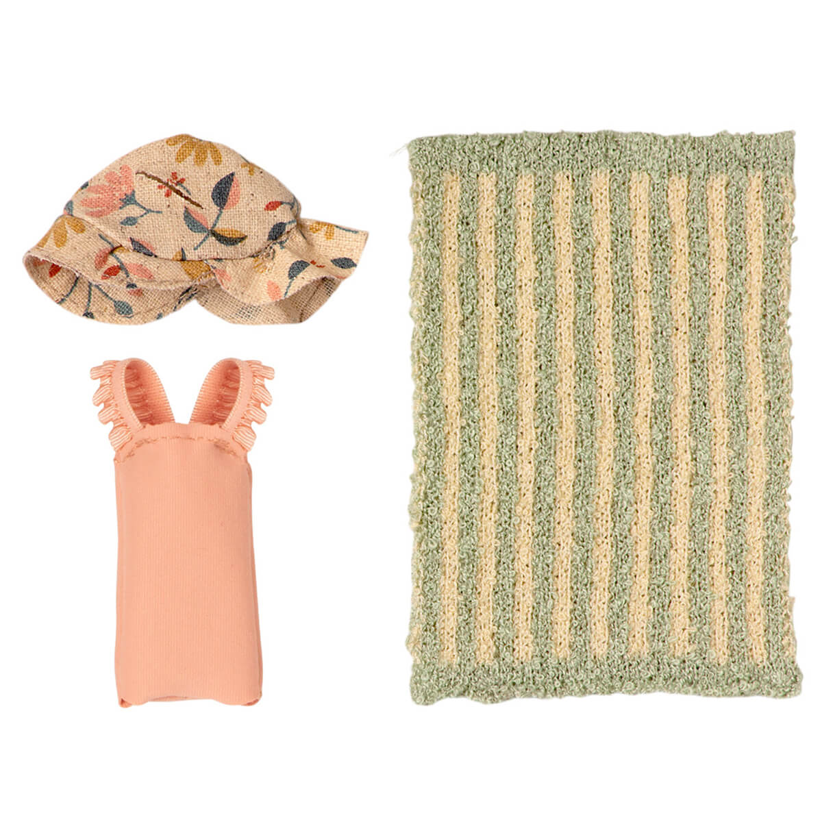 Beach Set for Big Sister Mouse by Maileg. Vacation time! This set includes all essential accessories for a fun day at the beach: a bathing suit, sunhat, and a towel. It all fits the mice in size big brother/sister perfectly. (Mouse sold seperately)