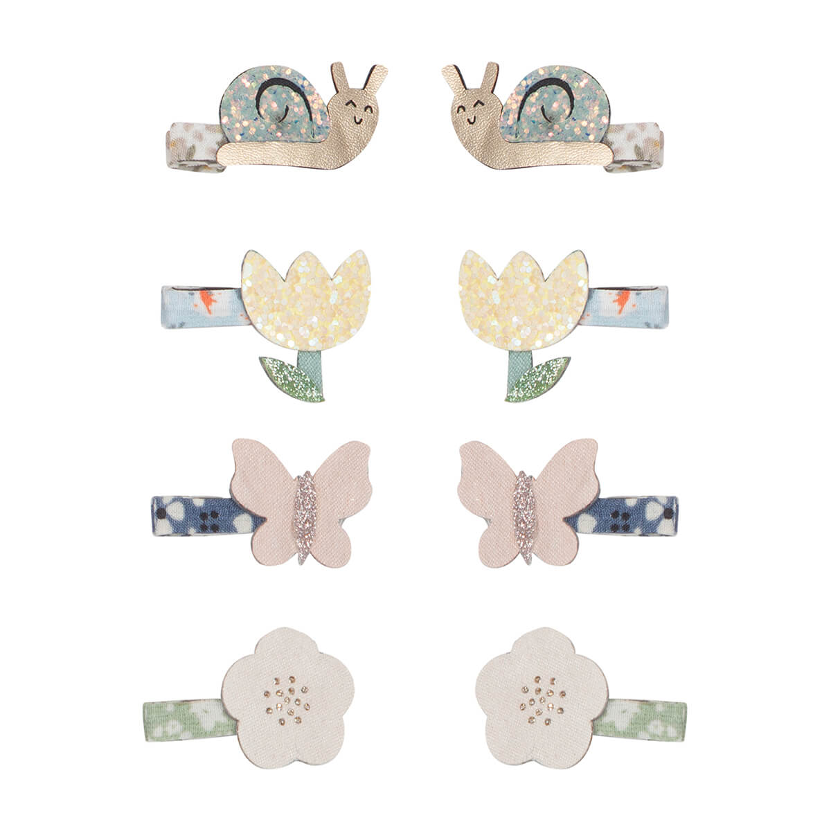Garden Mini Hair Clips by Mimi & Lula. Budding gardeners and outdoor lovers alike will go crazy for these lovely sparkly mini alligator hair clips. Featuring snails, butterflies and flowers intricately crafted from soft leatherette glitter, metallic and plain fabrics.