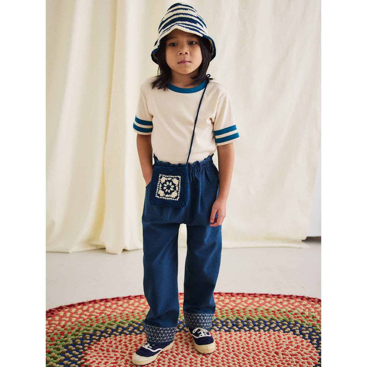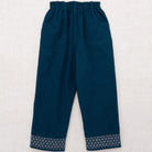 Little Paths Camp Pant by Misha & Puff. A relaxed pull-on pant in a structured organic cotton canvas, featuring a gathered elastic waist, embroidered stitch design at the hem, two patch pockets, and one back pocket.