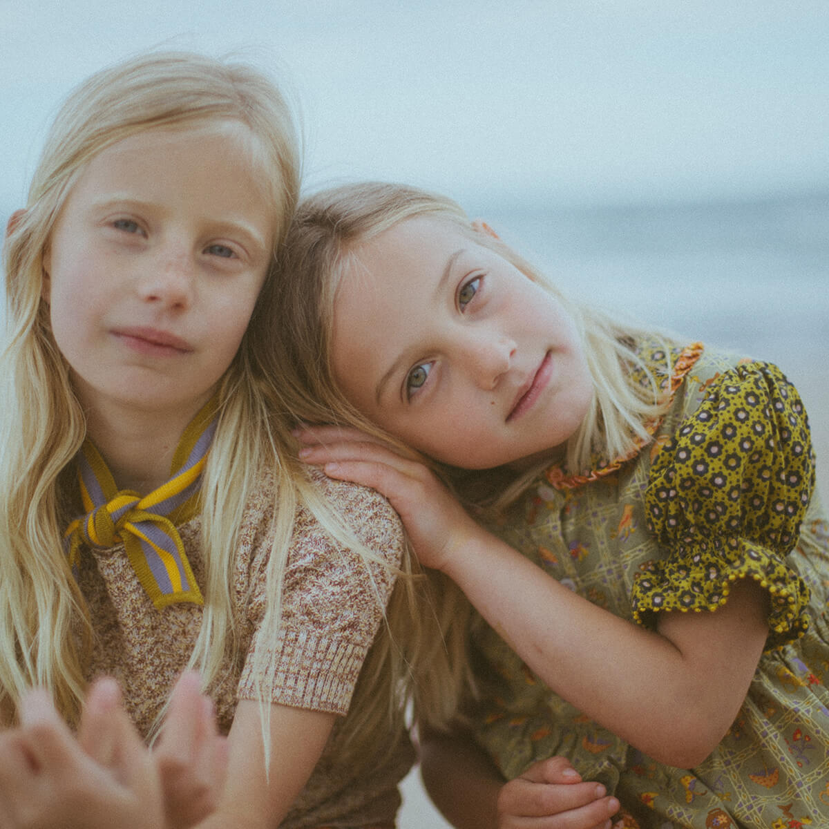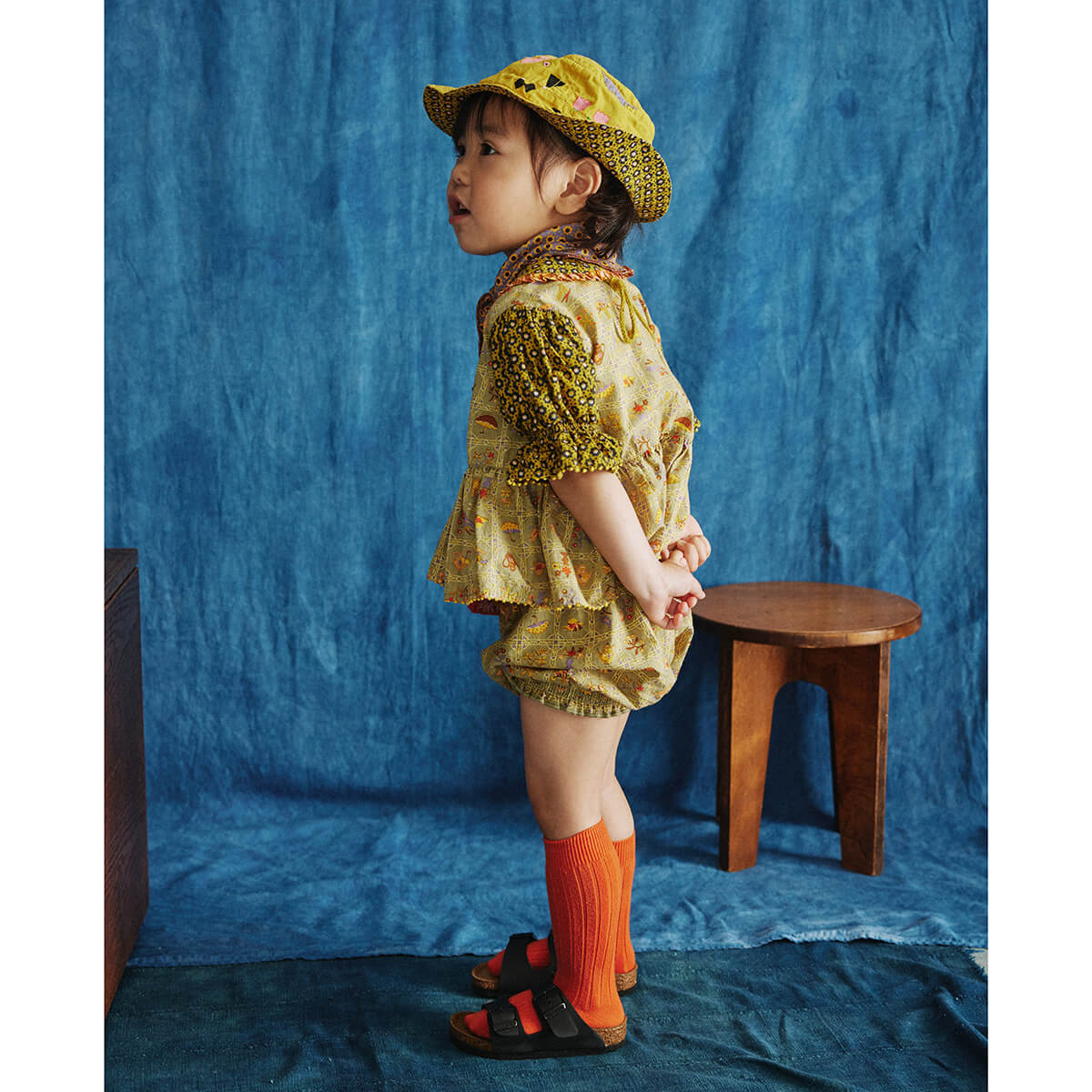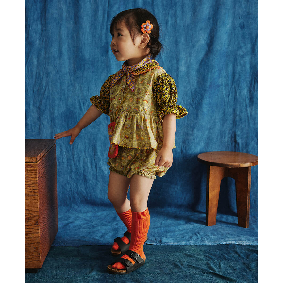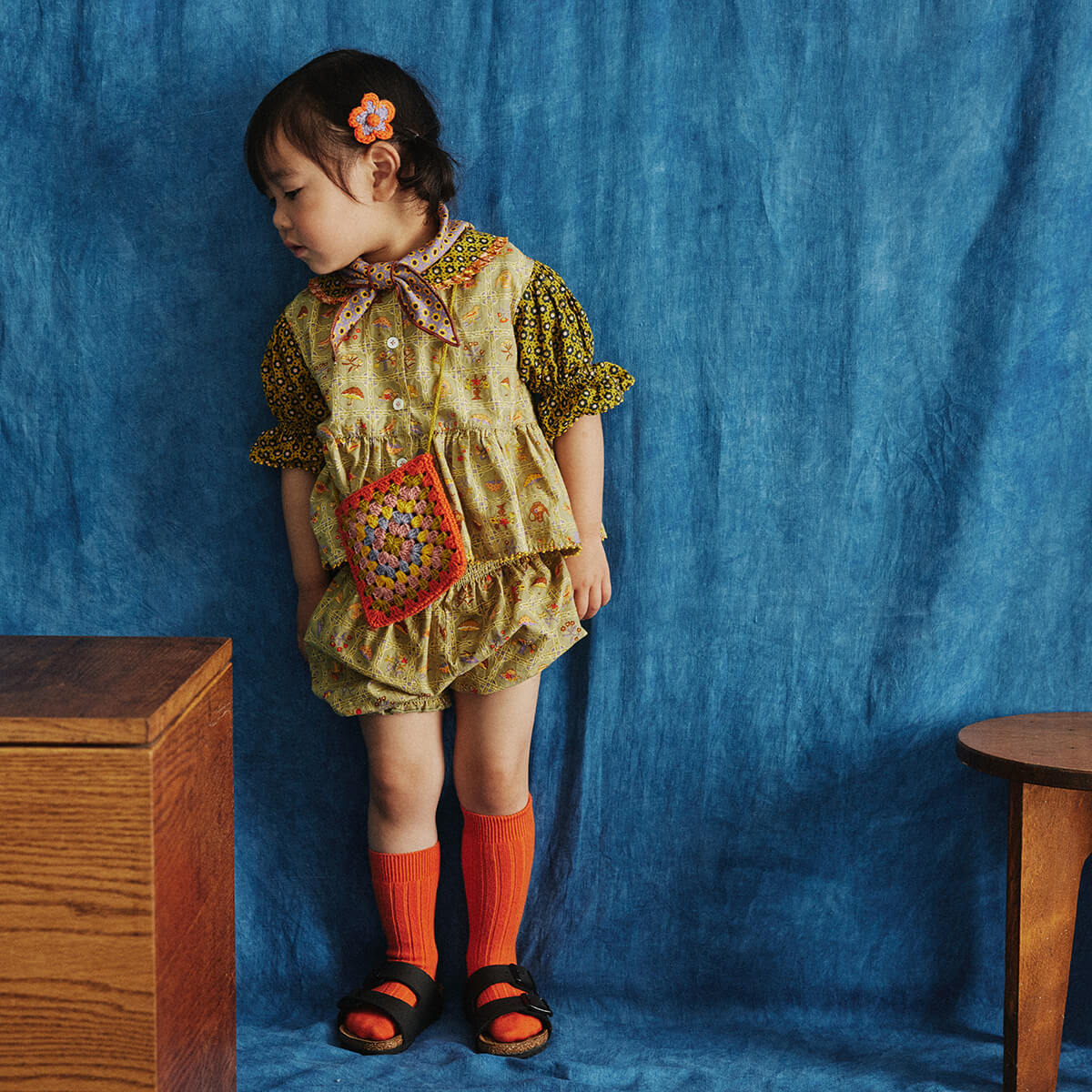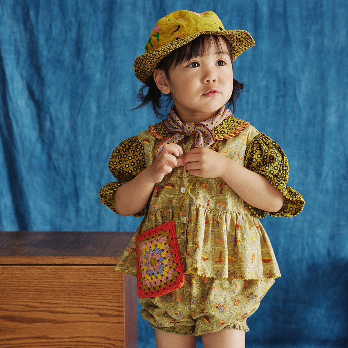 Esther Top by Misha & Puff. A new style for this season. A multi-print peplum top in Misha & Puff's latest 100% woven organic cotton poplin, with mid-length blouson sleeves with a ruffle cuff, rounded collar with contrast trim, shell button closure, and embroidered dot stitch detail at the cuffs and hem. Featuring this season's screenprinted Vert Trellis graphic print.
