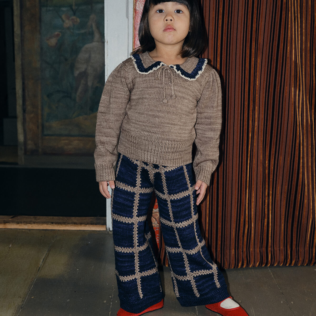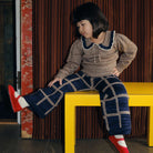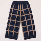 Ladder Square Wide Leg Pant by Misha & Puff. A wide-leg pull-on trouser in Merino wool, featuring knit patchwork with hand-crocheted detail, contrast trim, and a slightly cinched bottom cuff for an oversized jogger look. The hand-crocheted work gives this style a nice airiness to it.