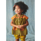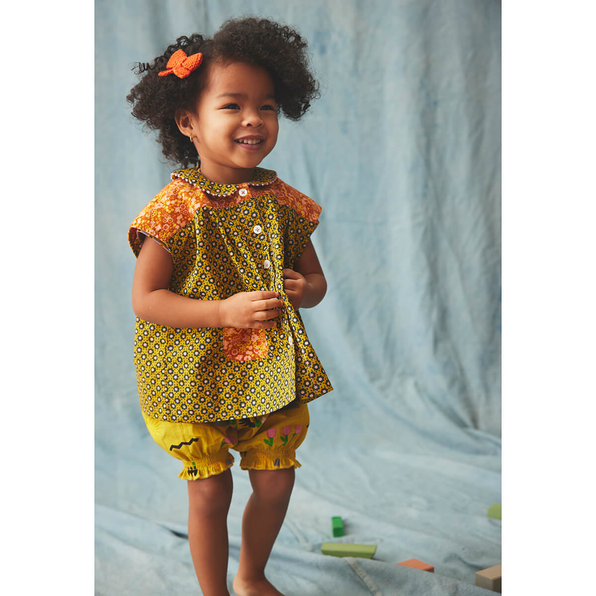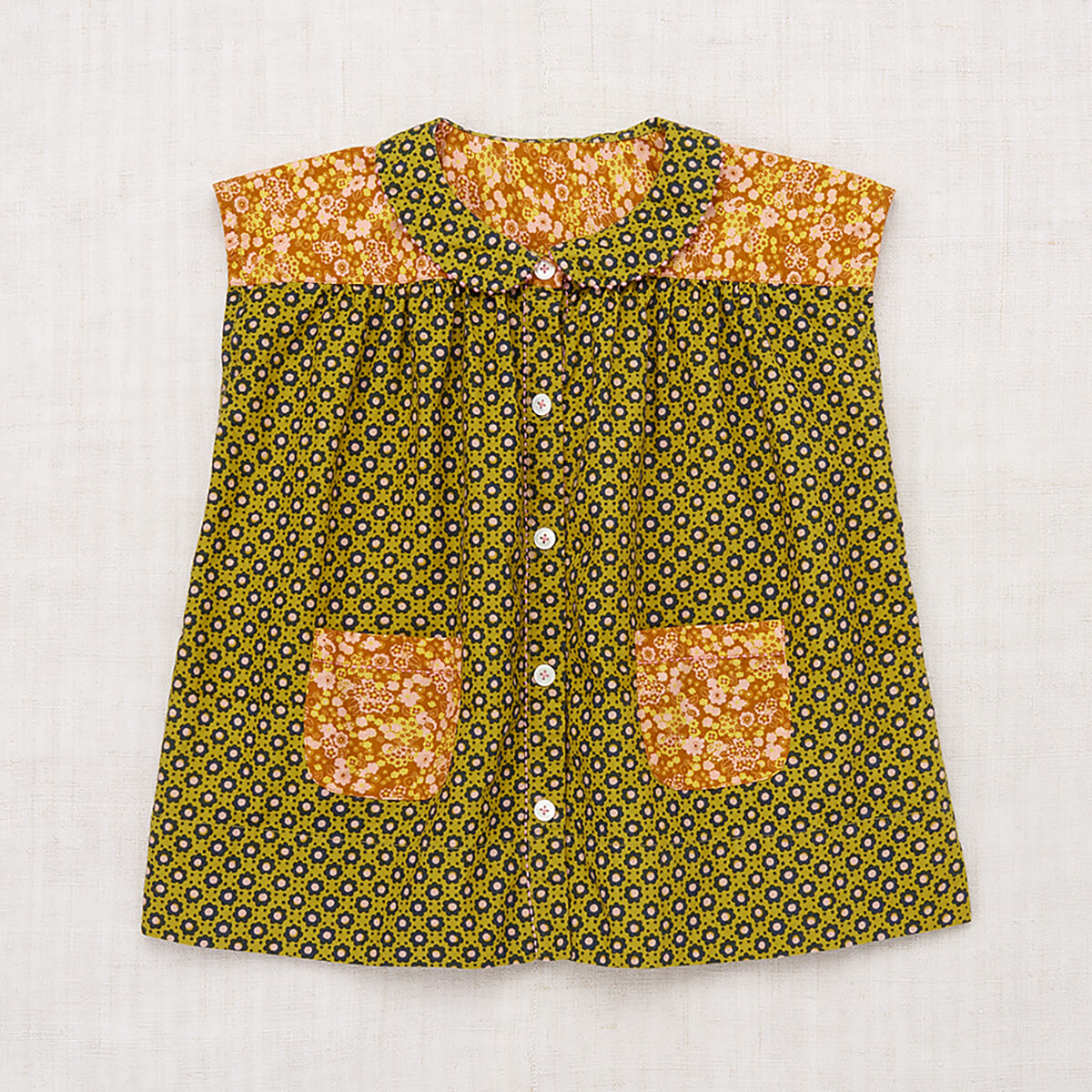 Nanna Tunic by Misha & Puff. A new style for this season. A multi-print sleeveless tunic in Misha & Puff's latest 100% woven organic cotton poplin, with gathering at the yoke, a rounded collar with embroidered dot stitch detail, patch pockets, and corozo button closure.