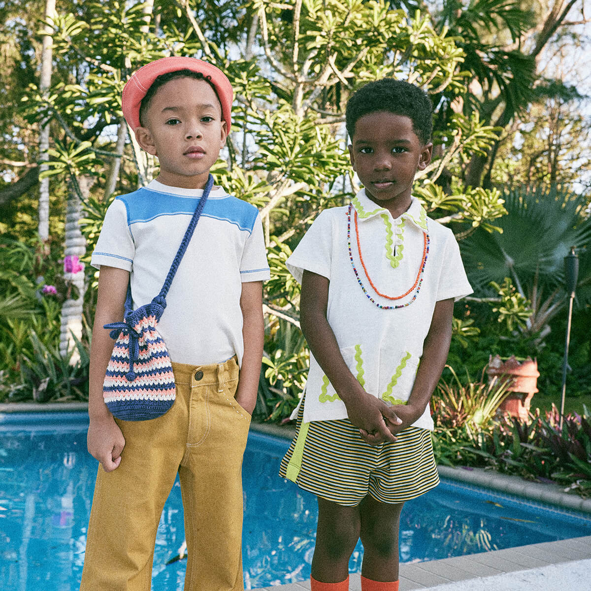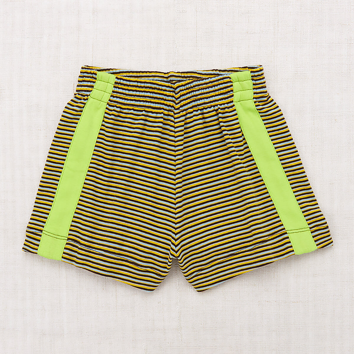 Resort Short in Bark Stripe by Misha & Puff. A vintage-style pull-on short in Pima cotton, with a gathered elastic waistband and contrast appliqué striped sides. Featuring this season's graphic print.