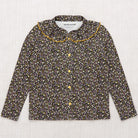 Rowan Top by Misha & Puff. A long-sleeved top in Pima cotton, featuring a short stand collar with an adjoining ruffle detail, finished with a contrast merrowed edge and mini bow, and a front snap closure.