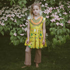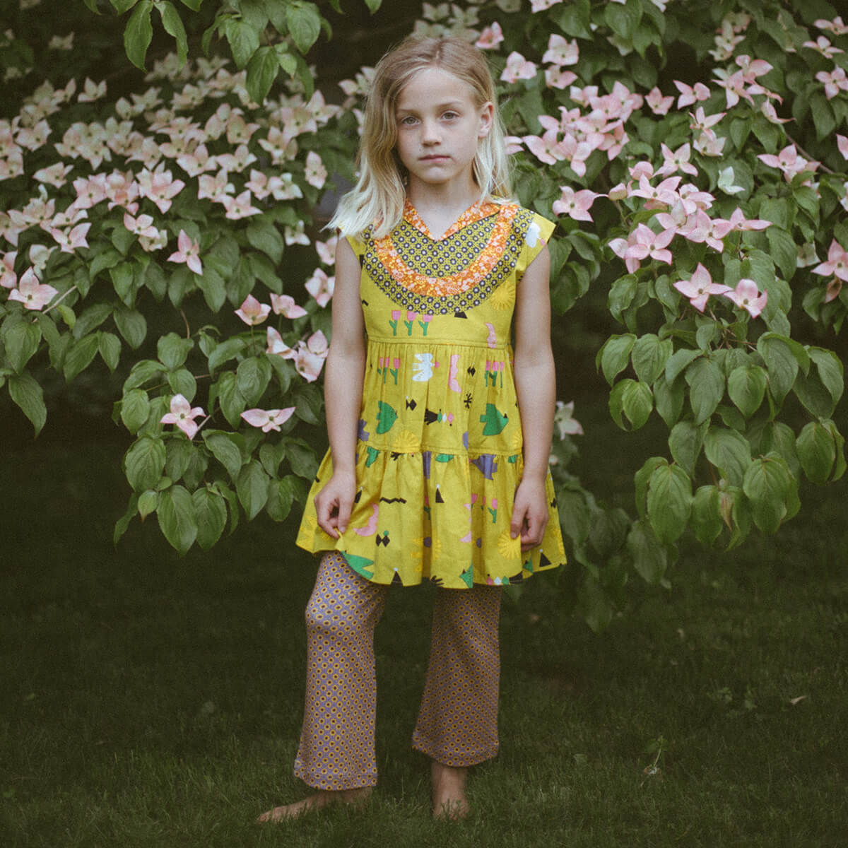 Ruthie Dress by Misha & Puff. A new style for this season. A multi-print sleeveless dress in Misha & Puff's latest 100% woven organic cotton poplin, with a v-neck shape, layered bib, and tiered ruffles. Featuring this season's Watercolor Stripe print in the bib, which was developed using a traditional Indian hand block printing technique, requiring great artistry and years of experience.