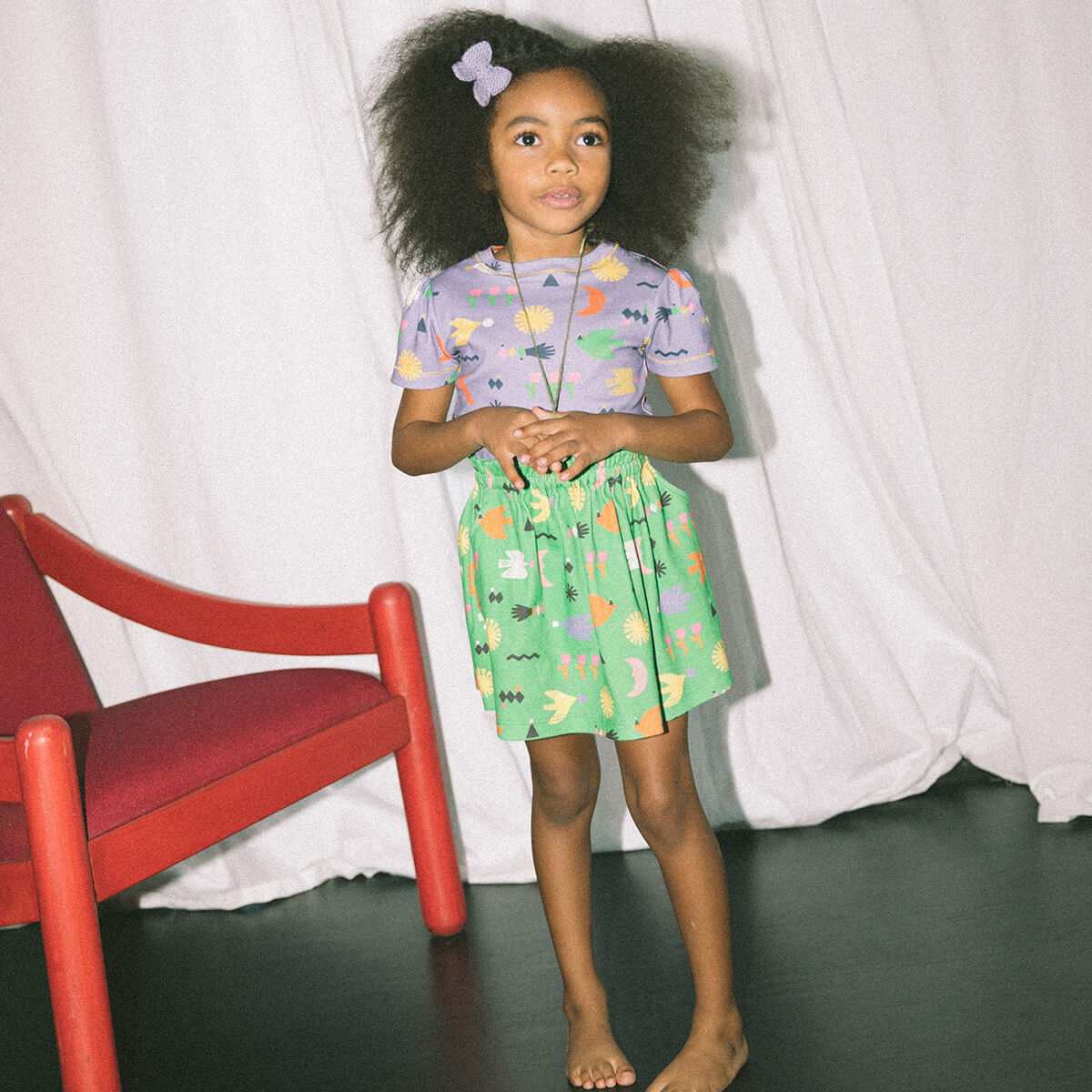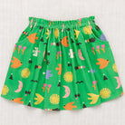 Sadie Skirt by Misha & Puff. A sweet pull-on skirt in a new 100% organic cotton, with a cinched ruffle elastic waist, two front pockets, and a short, flowy shape. Our 100% organic cotton is a slightly heavier weight than our Pima, but still soft. This piece is part of this season’s collaboration collection — with artist Julie Daleyden. Featuring the artist’s all-over graphic print.