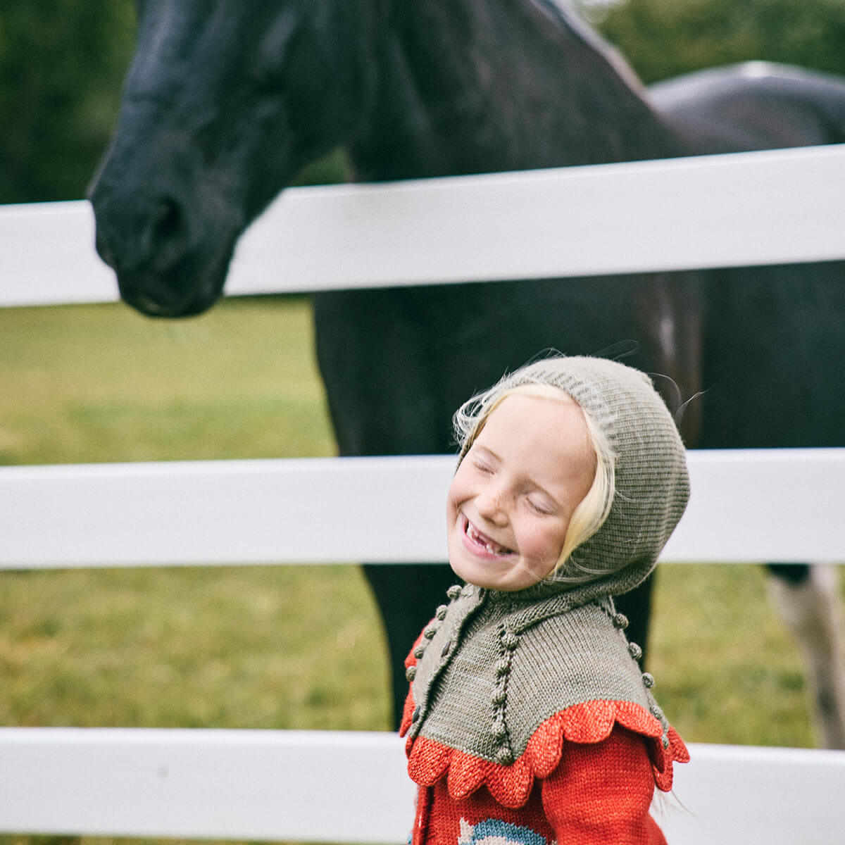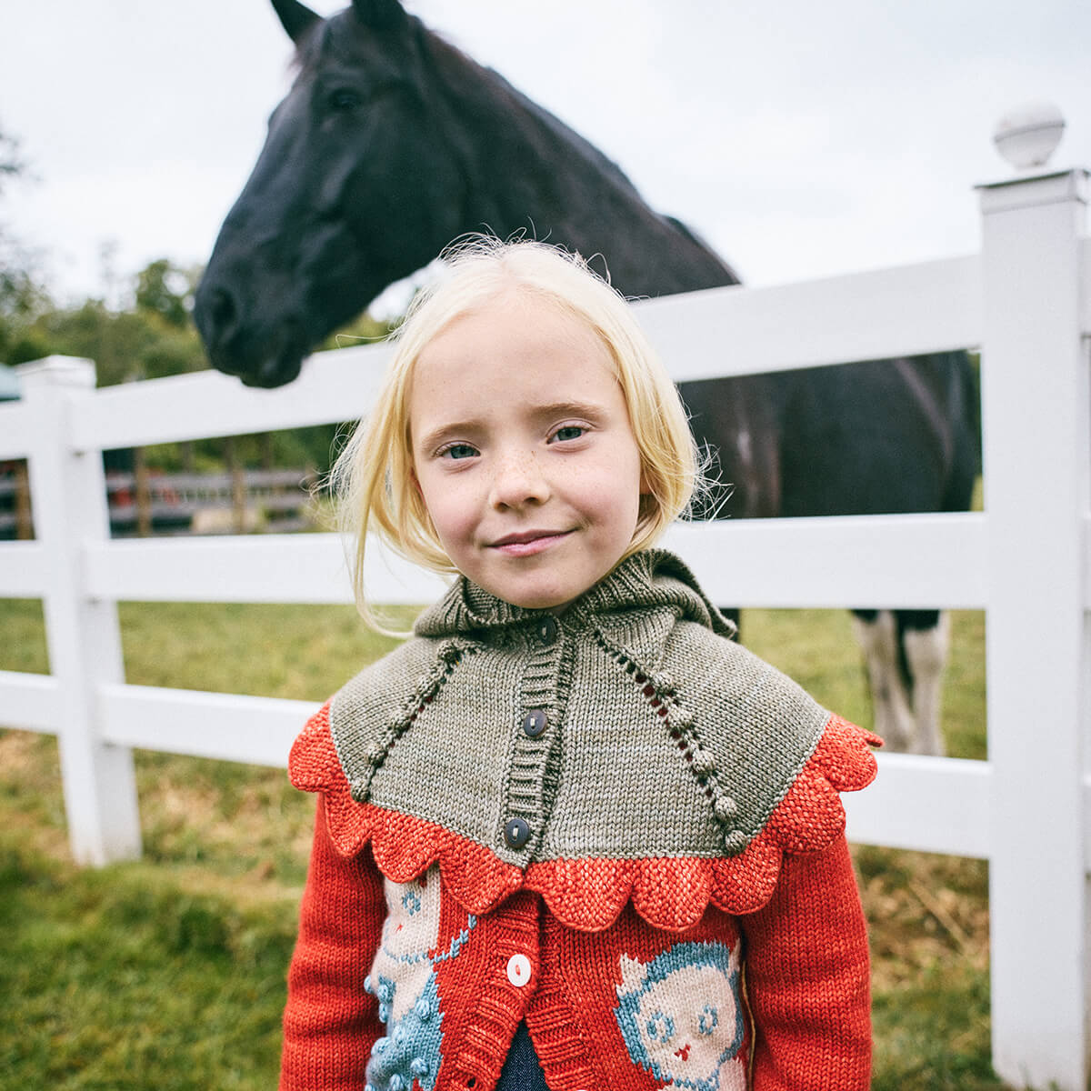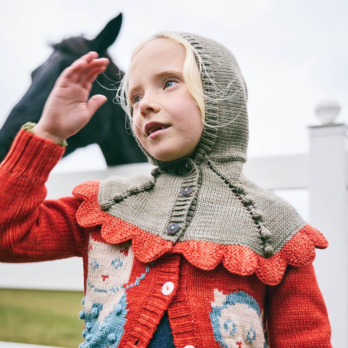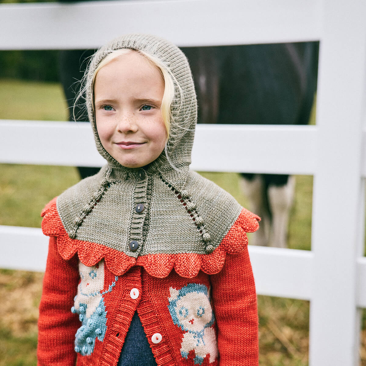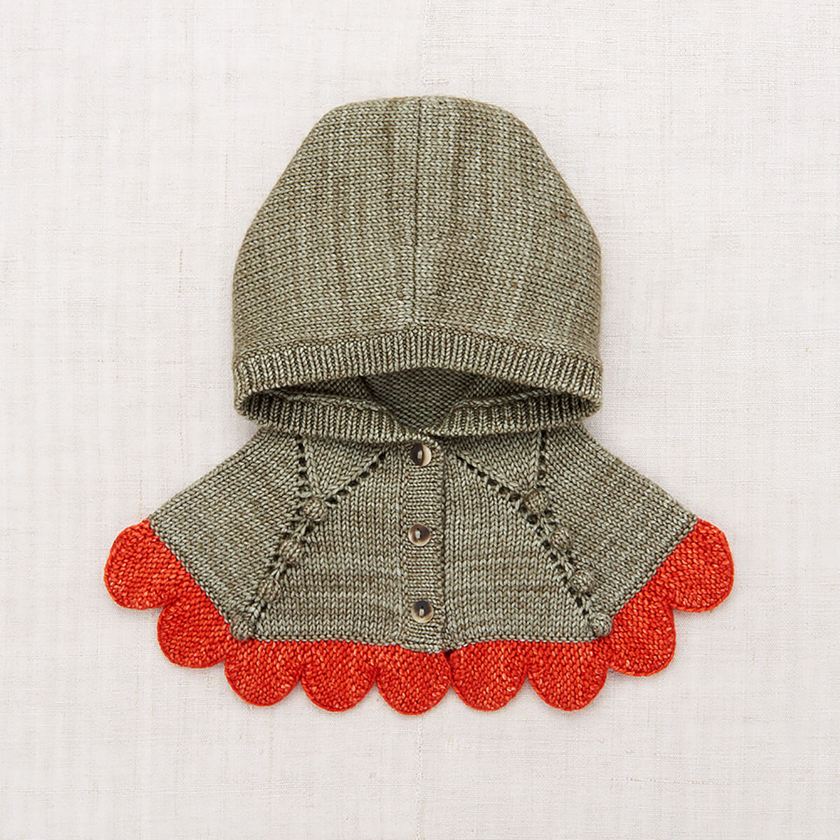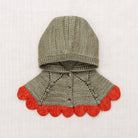 Scallop Capelet by Misha & Puff. A hand-knit capelet in a heavier-weight Merino wool, with a bonnet-style hood and a contrast scalloped edge that drapes down over the shoulders and horn button closure up the front.