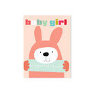 Mini Baby Girl New Baby Greetings Card by Kali Stileman Cards. A lovely little card to congratulate an exciting new arrival. This card features a sweet and smiley bear and colourful lettering against a baby pink background.