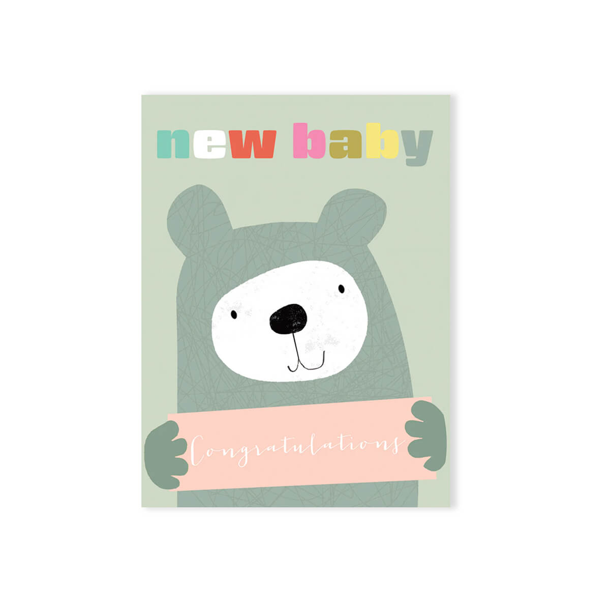 Mini New Baby Greetings Card by Kali Stileman Cards. A lovely little card to celebrate an exciting new arrival! This card features a sweet and smiley bear and lovely colourful lettering against a putty background.