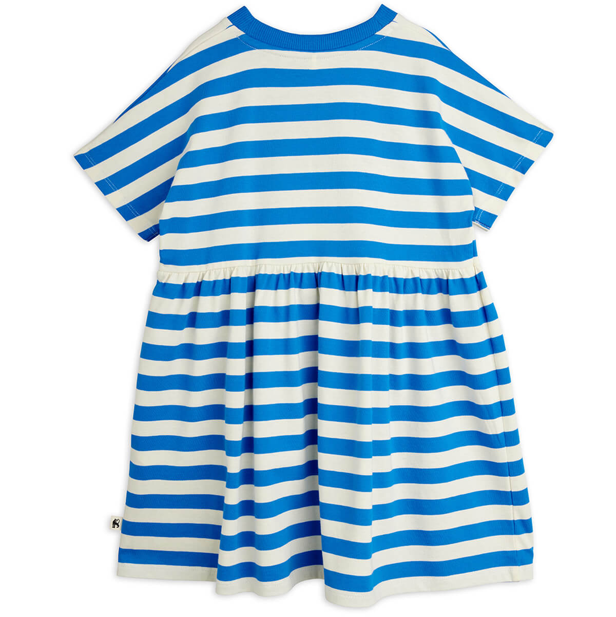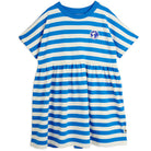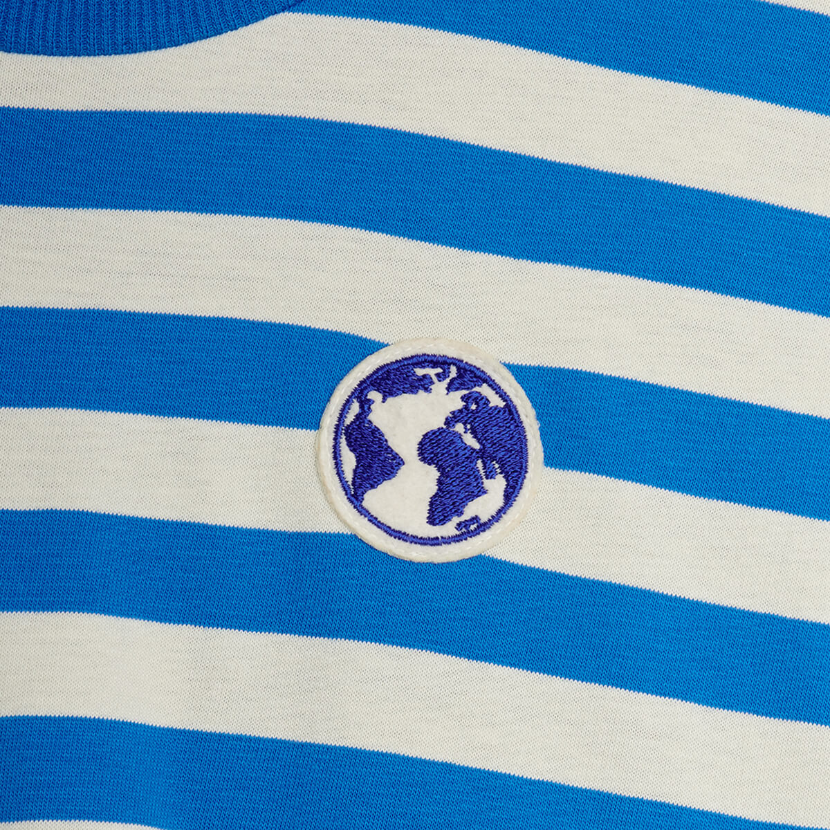 Earth Stripe Dress by Mini Rodini. Yarn dyed short sleeved jersey dress with an earth patch on the chest.