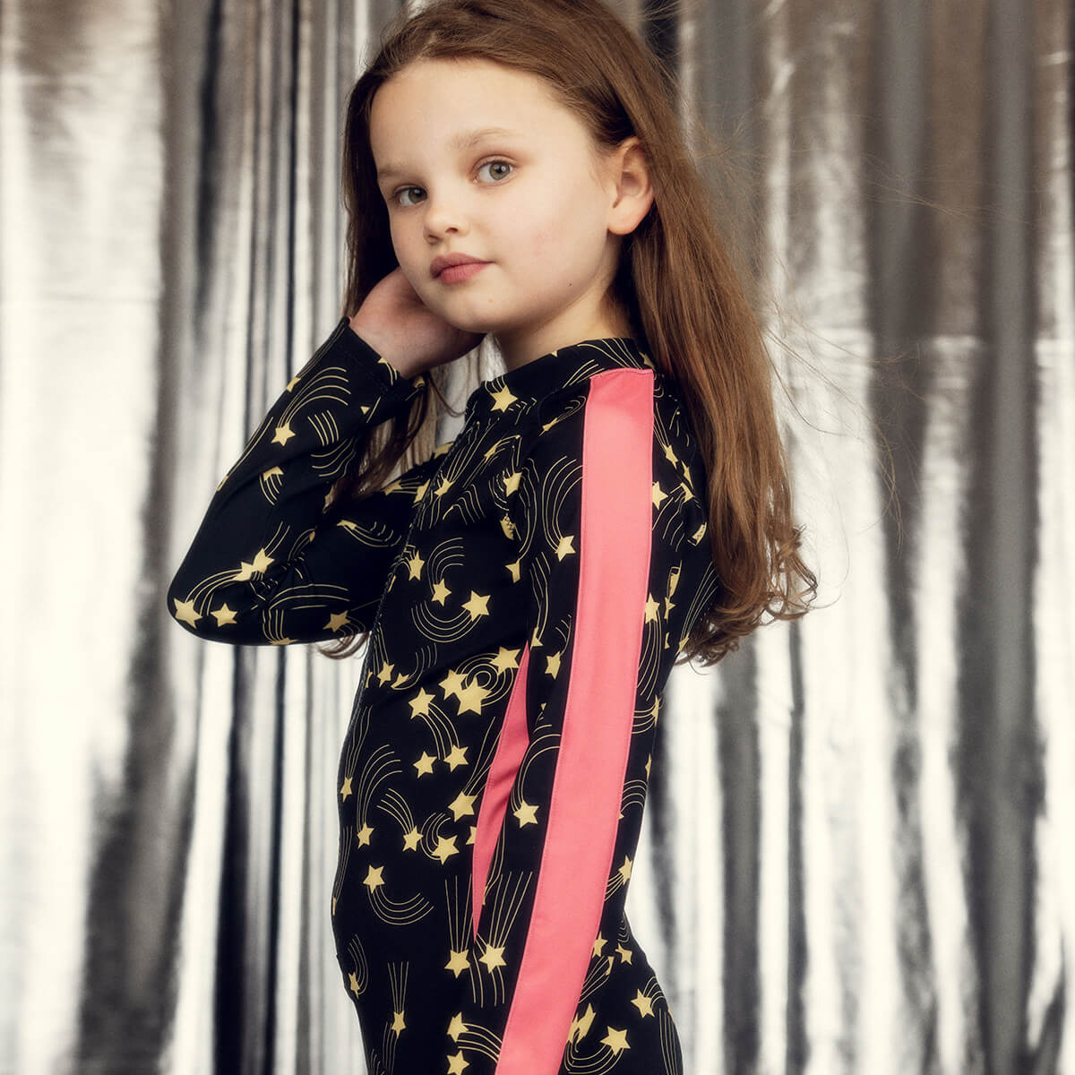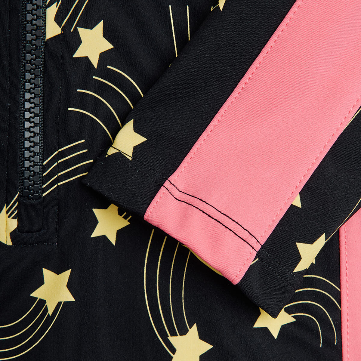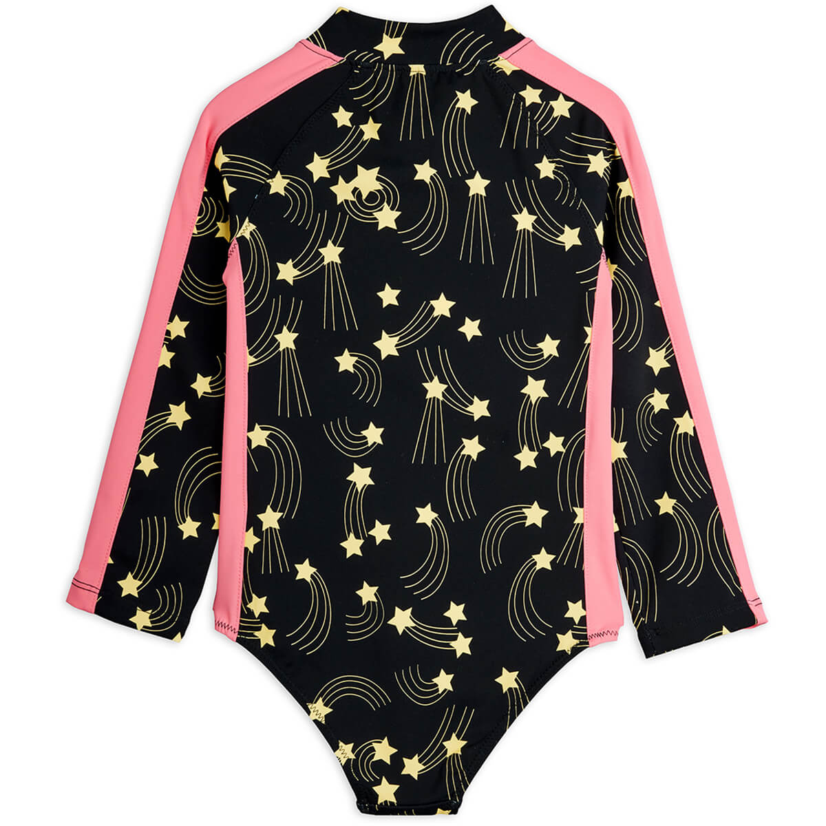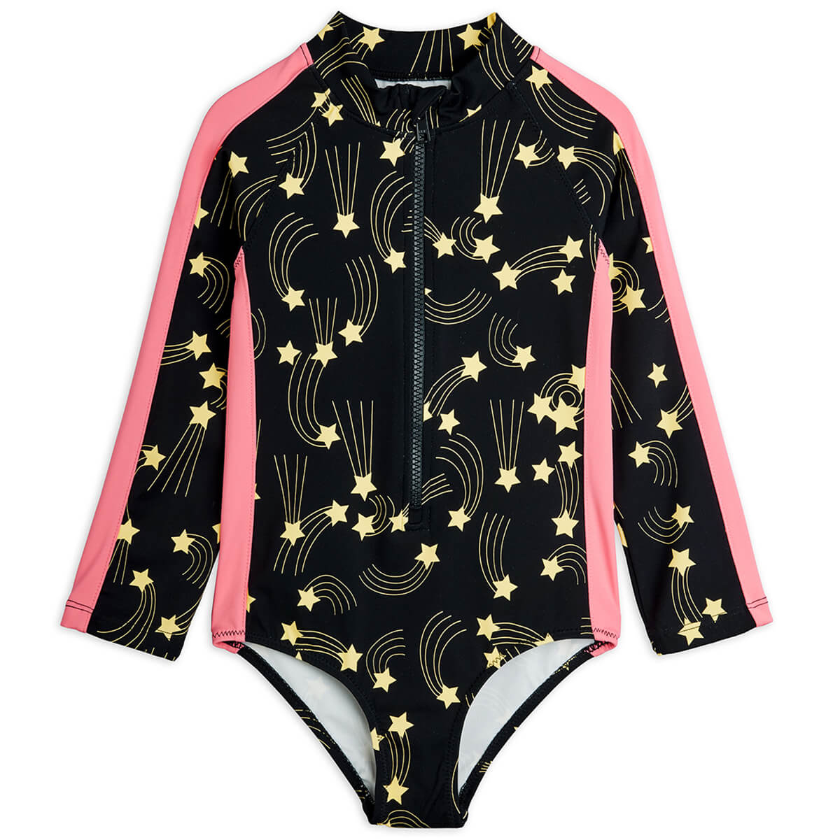 Starfall Swimsuit by Mini Rodini. UV protective swimsuit in recycled nylon with a starfall print. Long sleeves for extra sun protection. Front zip with chin guard for comfort and easy dressing.