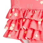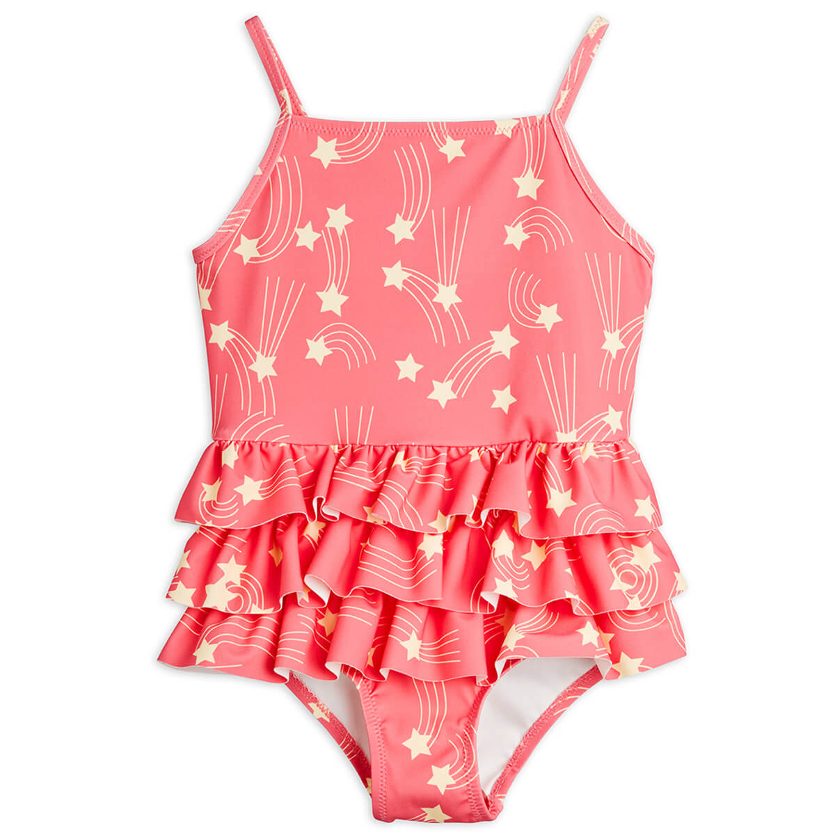 Starfall Swimsuit by Mini Rodini. One-piece swimsuit with thin shoulder straps. Three tiered ruffles at the waist for a playful skirt effect.