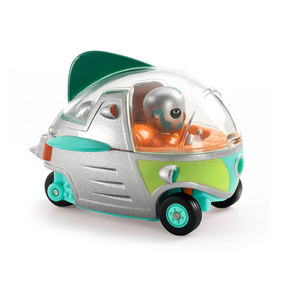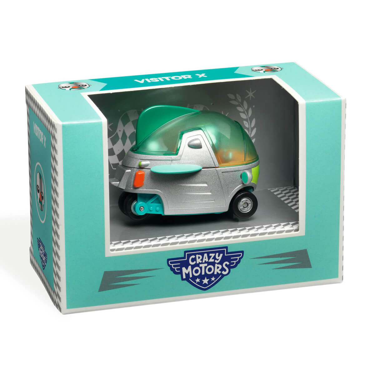 Crazy Motors Visitor X Toy Car by Djeco. This car is strange. No vehicle of this kind has ever been spotted before... Doubts remain. As soon as it was seen, it disappeared! Visitor X is an Unidentified Vehicle (UNV).