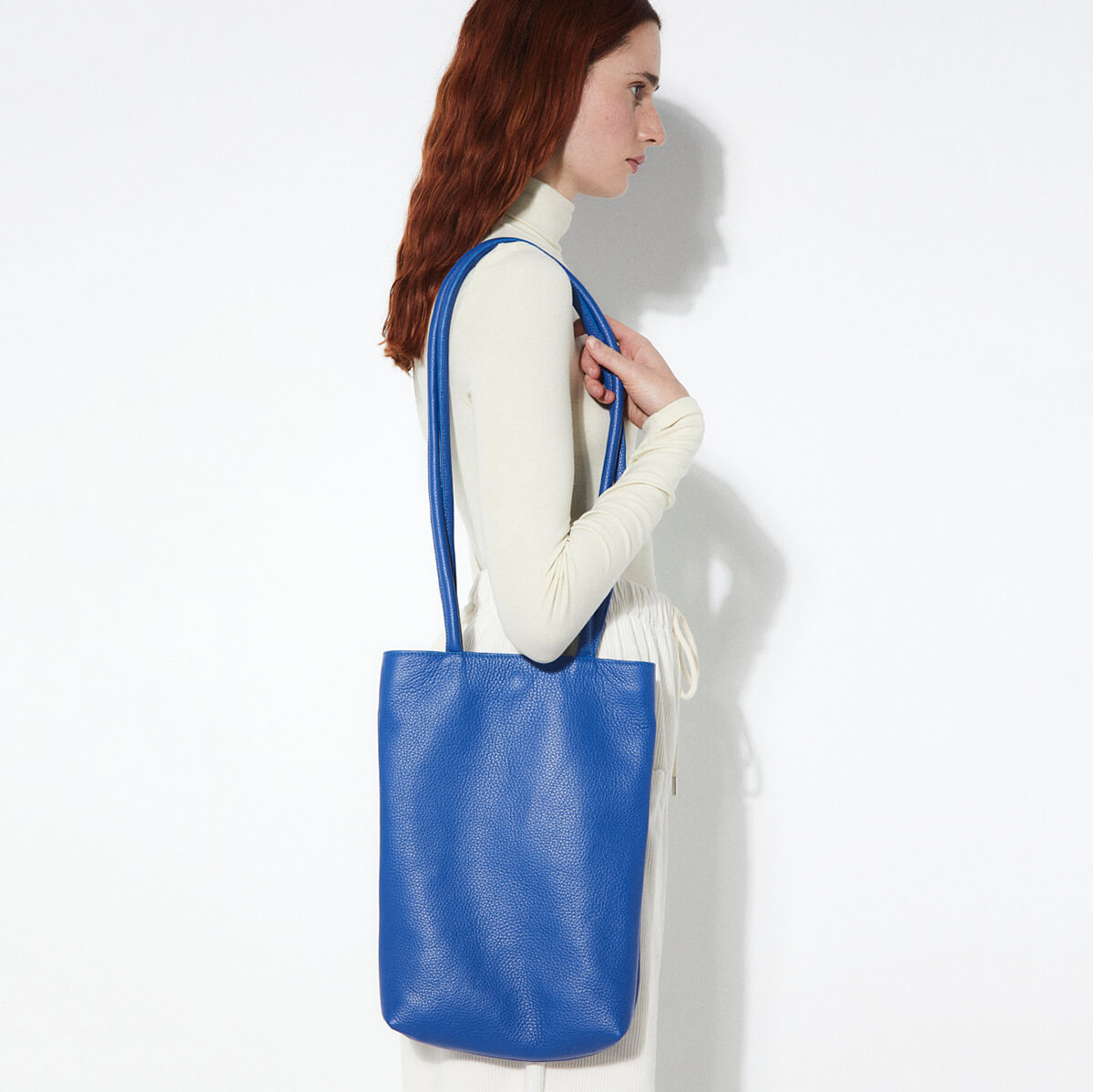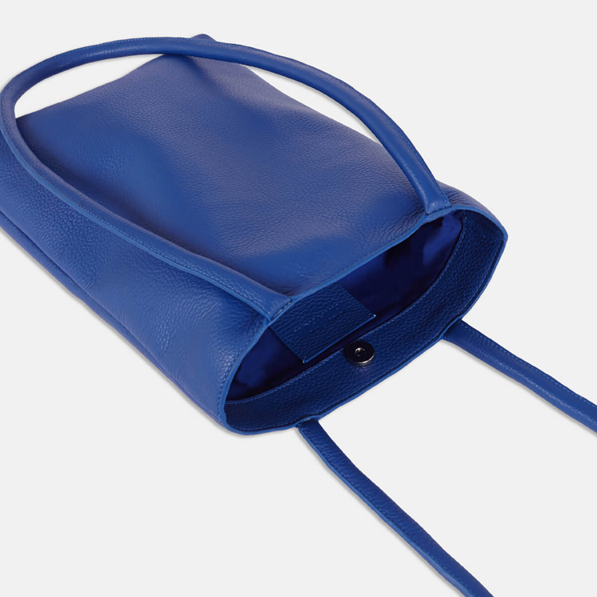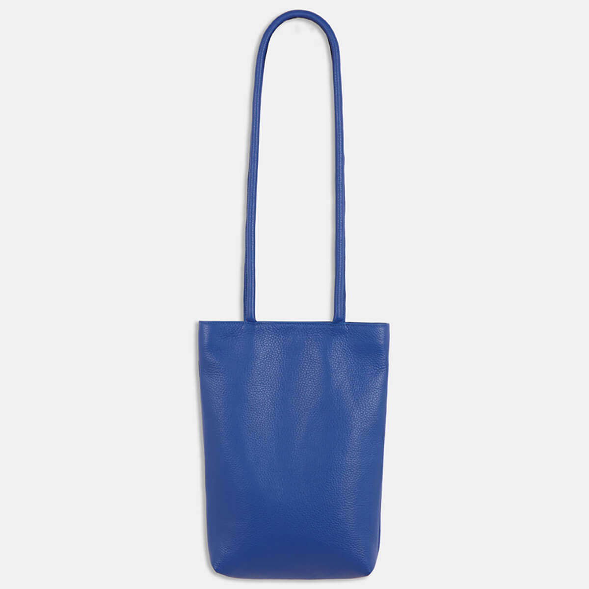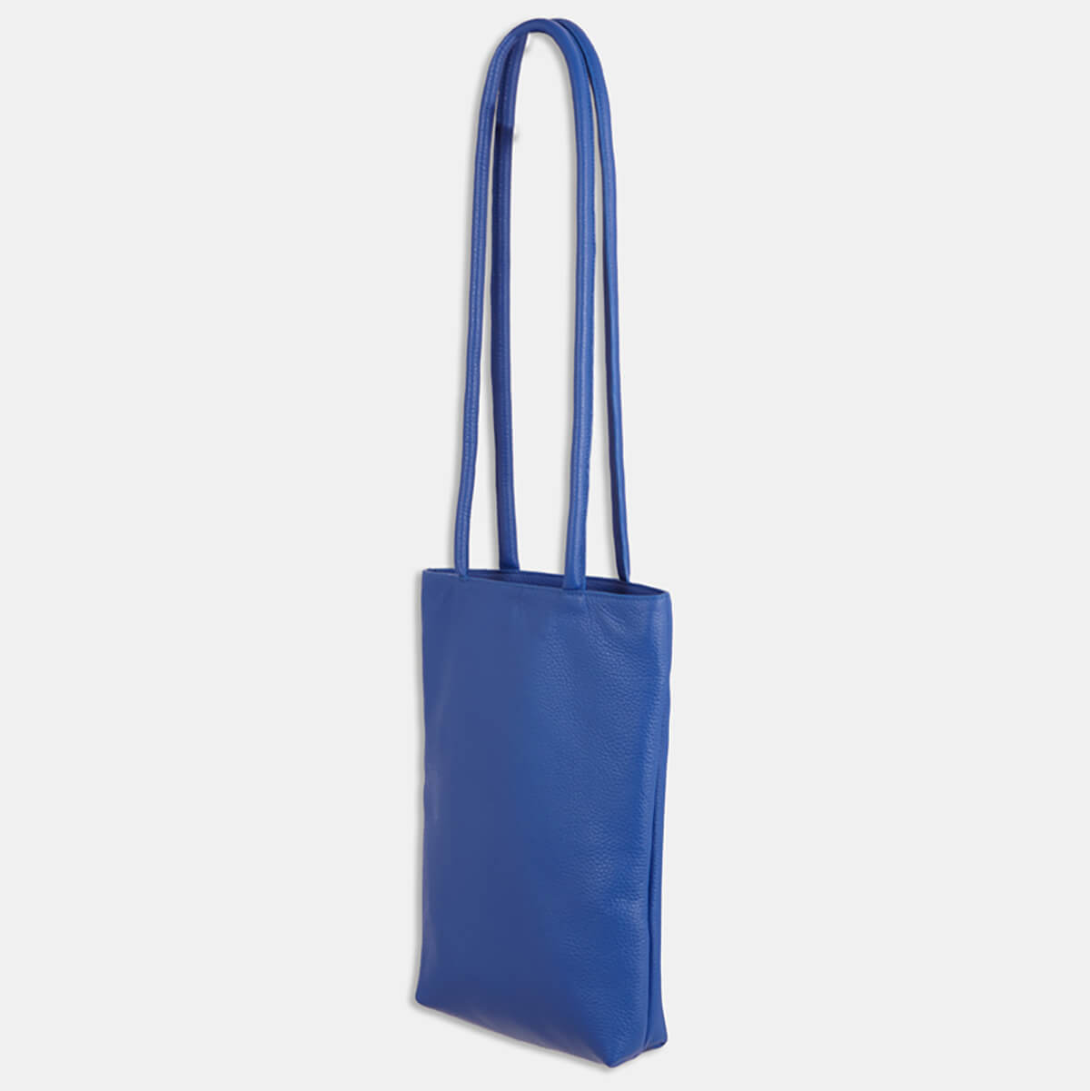 Cadec Bag in Blue by Rita Row. Leather bag featuring a long strap and an inside side pocket. Closes with a magnetic clasp. Can be worn across the body or over the shoulder.