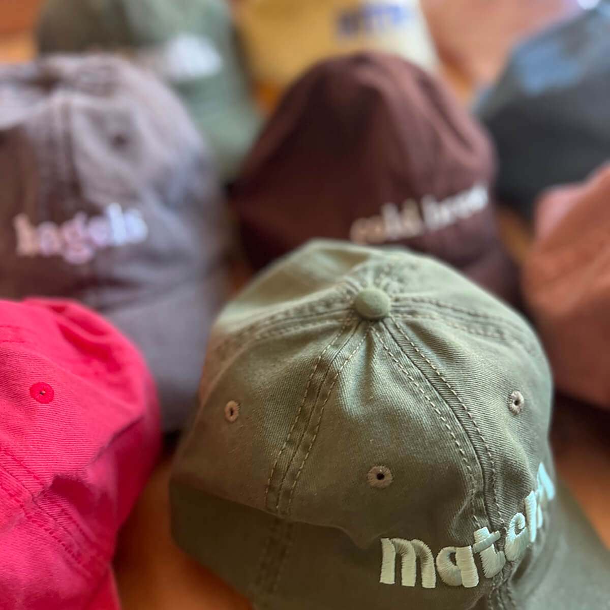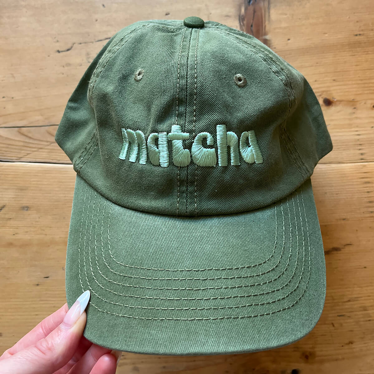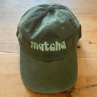 Matcha Baseball Cap by The Silver Spider. This vintage style 'dad' hat is designed to fit all matcha lovers. Olive green baseball cap with embroidered 'Matcha' design in wh, complete with an adjustable strap.