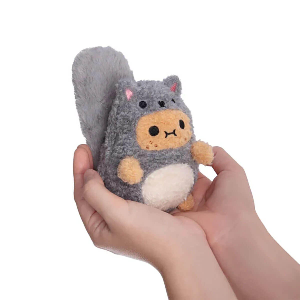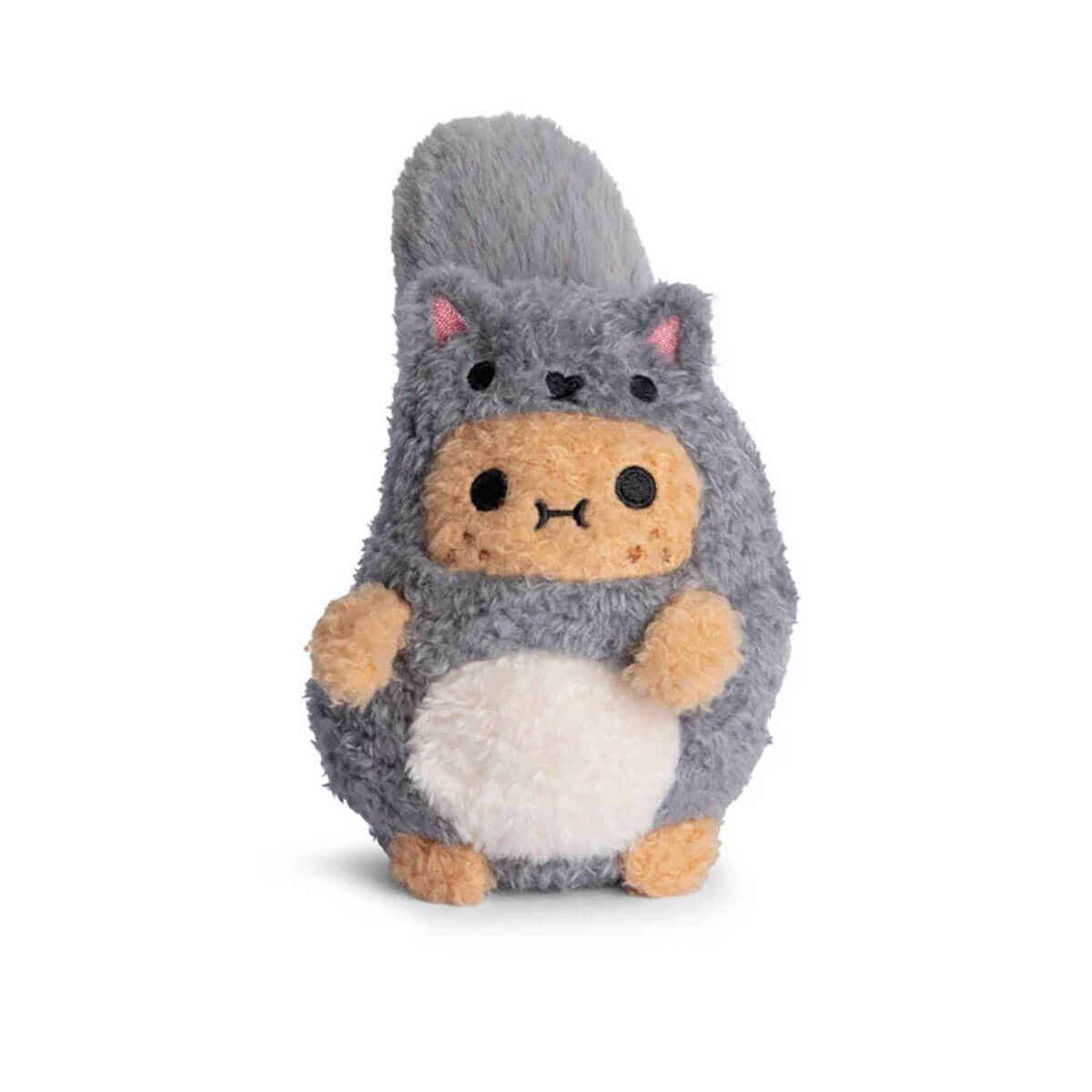 Ricespud Grey Squirrel Mini Sitting Plush Toy by NooDoll. Leaping through the trees of Ricejungle at incredible speeds — here comes Grey Squirrel Ricespud! This acorn-loving spud is full of charm and energy, perfect for the spring season. This mini potato plushie is dressed in an adorable grey squirrel suit and features one of the fluffiest tails ever seen in Ricespud history, complete with a heart-shaped Velcro patch so you can fasten it upright or leave it hanging down. This adventurous spud also loves to play with their cousin, Red Squirrel Ricespud, making for the perfect duo set!
