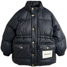 Heavy hooded puffer jacket by Mini Rodini. A heavily padded windproof coat with a removable hood. Featured side pockets and placket covered zip and snap buttons at placket for extra protection.