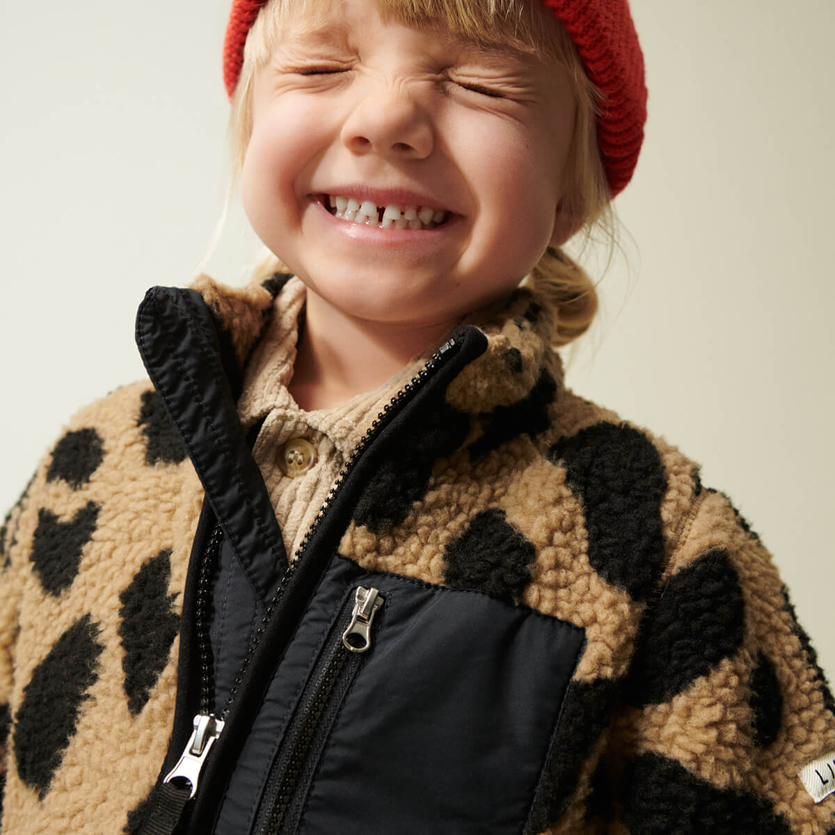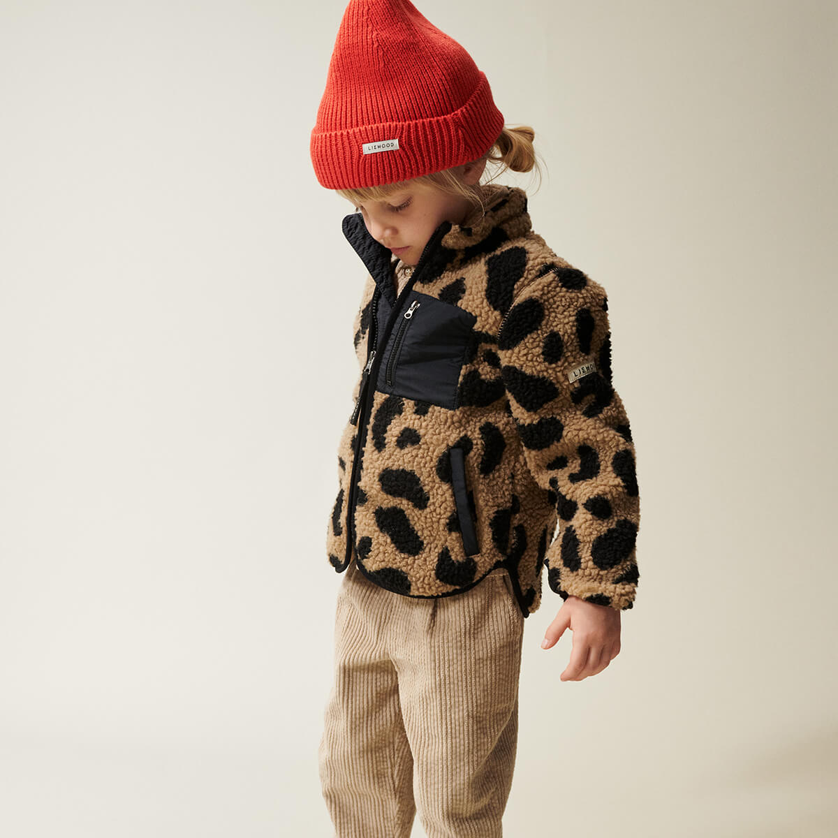 Nolan Pile Jacket by Liewood. This cosy and practical coat features a zipper closure, thumb holes and name tag. Can be worn on its own or as an extra warm layer.