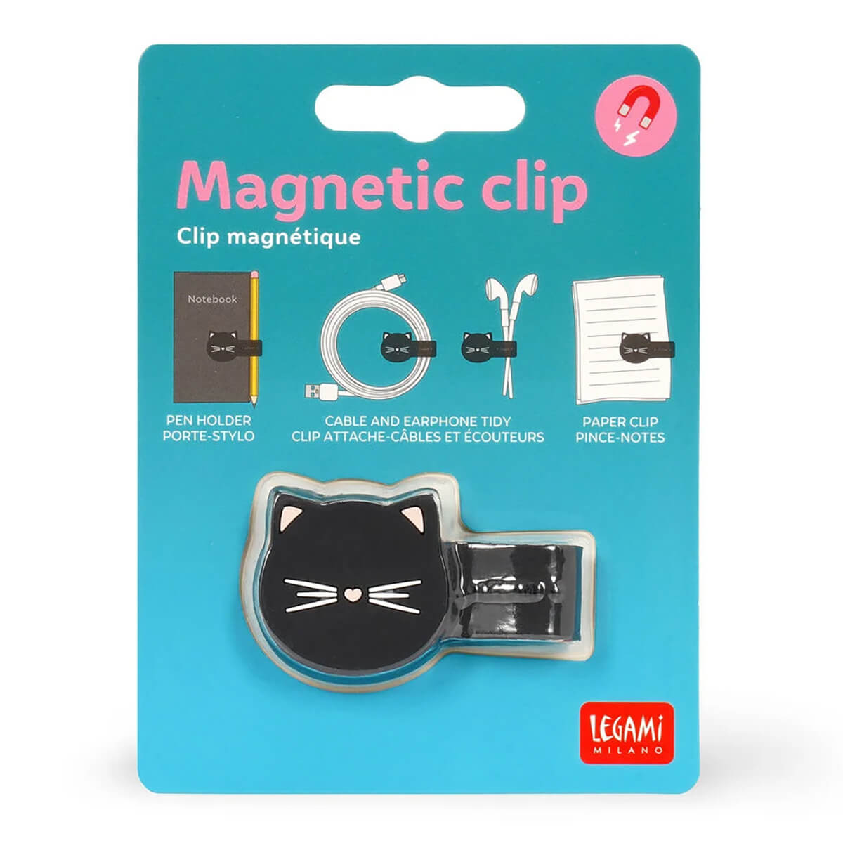 Cat magnetic clip by Legami. The Legami Magnetic Clip - Kitty will help you keep your cables tidy while bringing a smile to your face with its adorable design. Versatile and practical, it is also suitable for attaching your pen to your notebook, organising a stack of loose sheets, and much more.