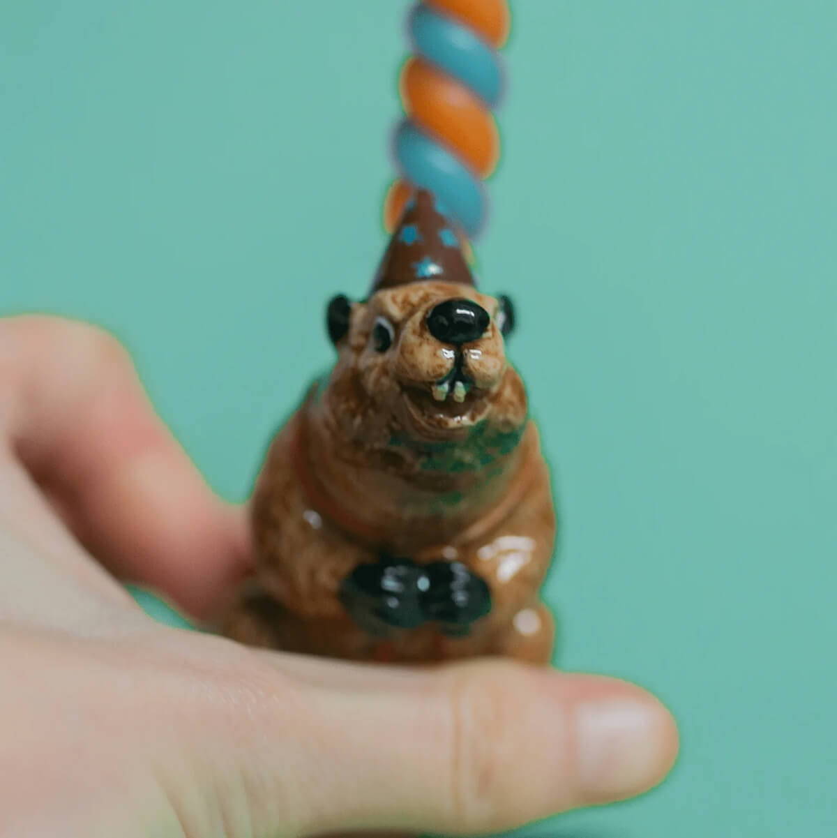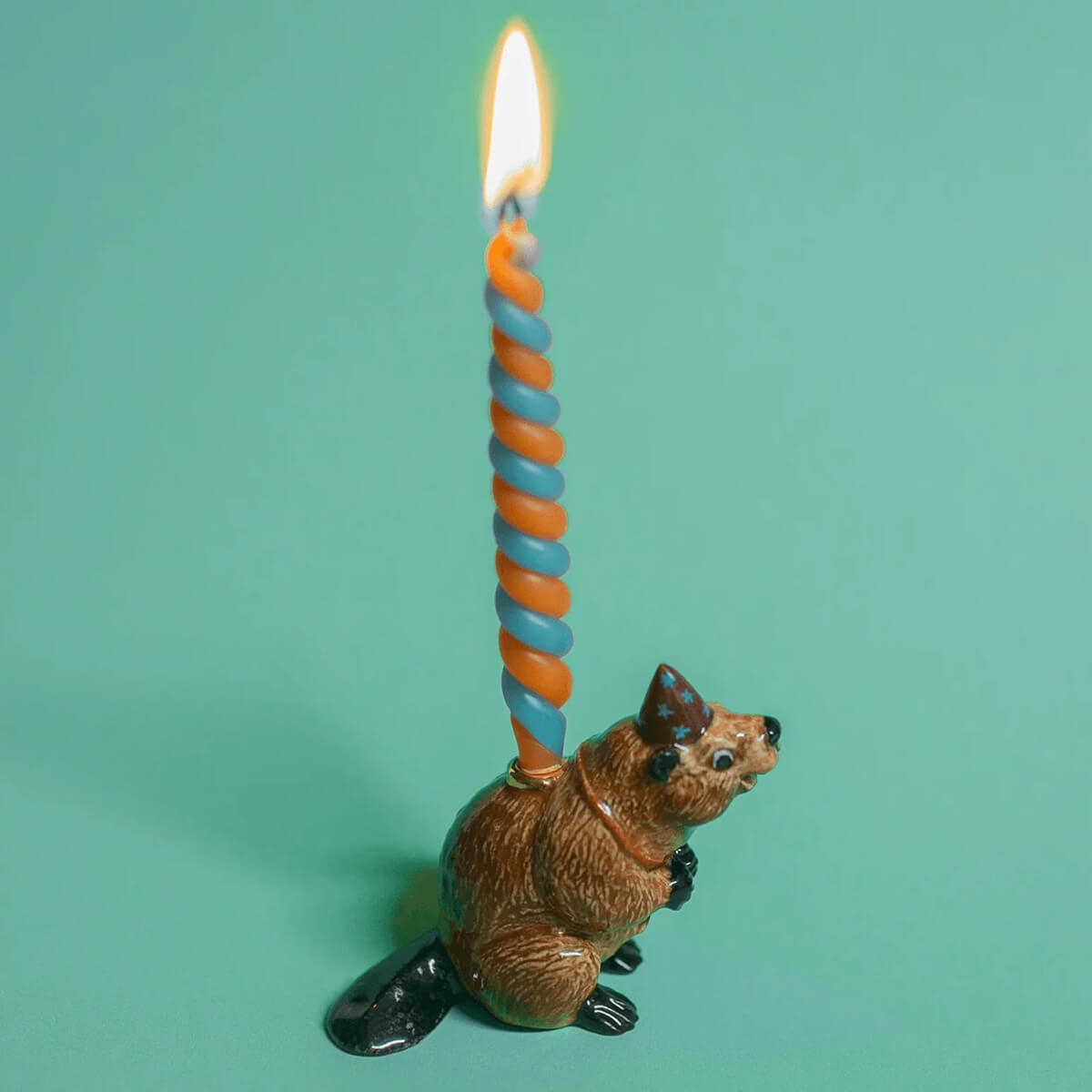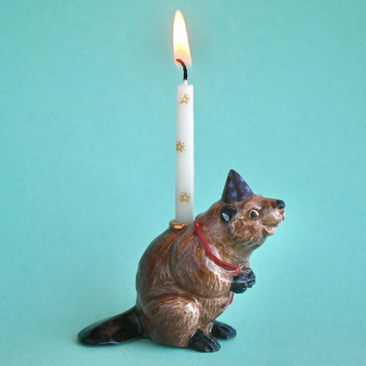 Beaver ceramic cake topper by Camp Hollow. This porcelain cake topper adds a whimsical charm to any celebration, featuring an adorable beaver wearing a festive party hat. Made from high-quality, food-safe materials, it is ideal for birthdays, themed parties and special occasions. The lifelike design and intricate details make it a delightful keepsake long after the event. Add a unique and fun touch to your cake with this adorable topper. Crafted in fine porcelain and meticulously hand-painted, this beautiful heirloom quality candle holder will celebrate every birthday and occasion for years to come.