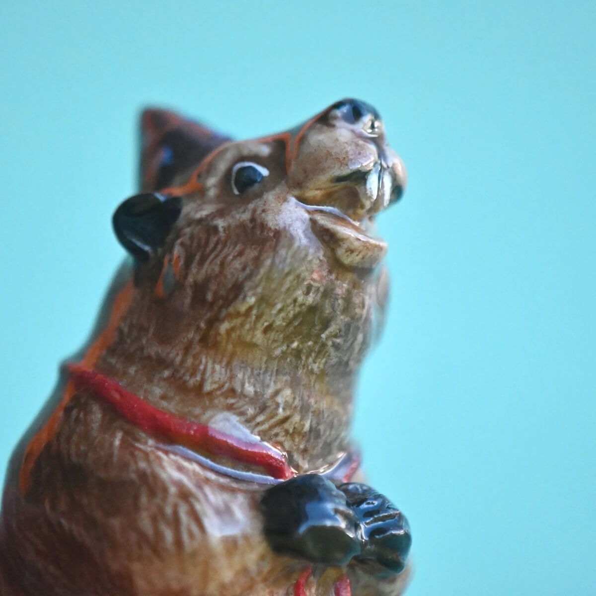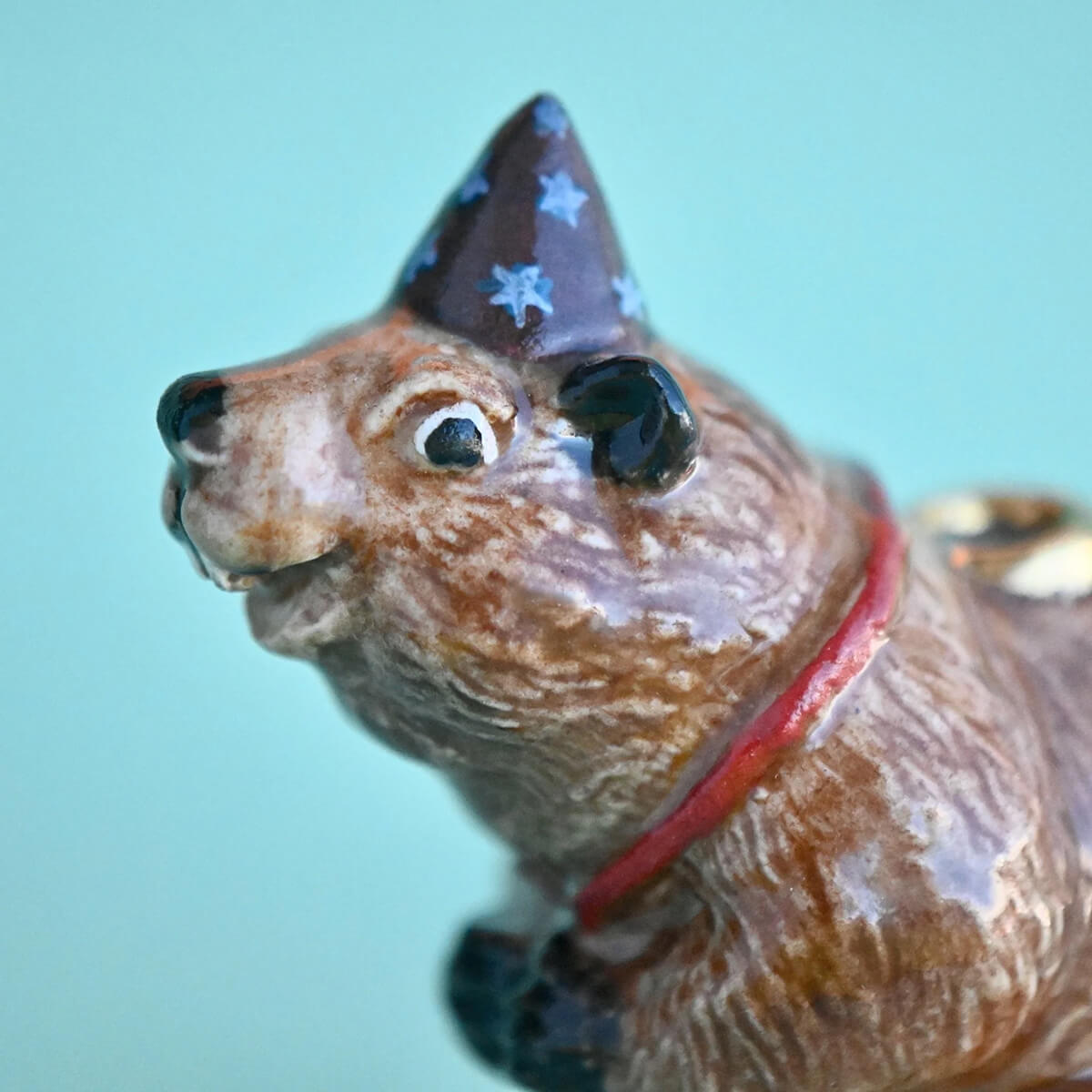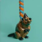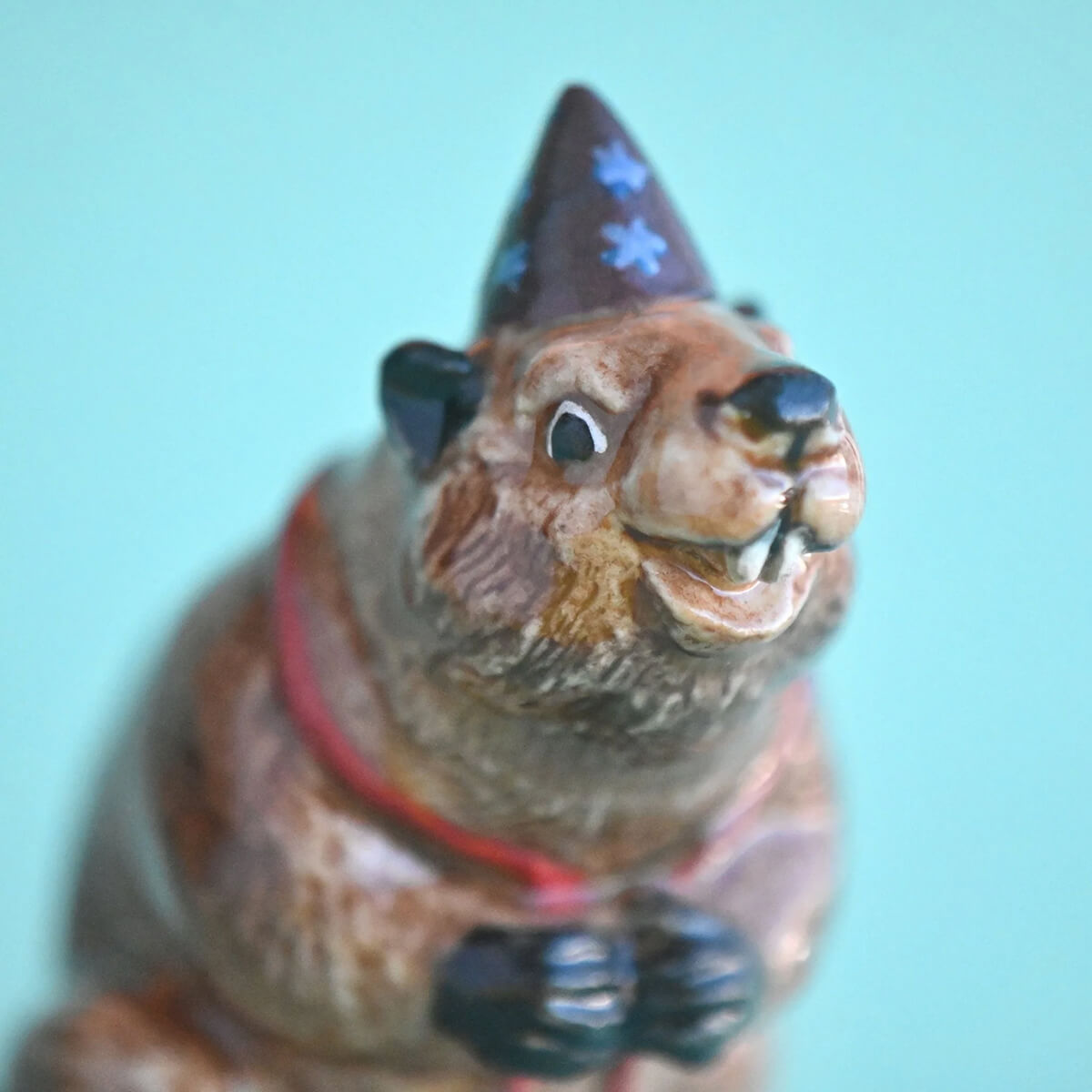 Beaver ceramic cake topper by Camp Hollow. This porcelain cake topper adds a whimsical charm to any celebration, featuring an adorable beaver wearing a festive party hat. Made from high-quality, food-safe materials, it is ideal for birthdays, themed parties and special occasions. The lifelike design and intricate details make it a delightful keepsake long after the event. Add a unique and fun touch to your cake with this adorable topper. Crafted in fine porcelain and meticulously hand-painted, this beautiful heirloom quality candle holder will celebrate every birthday and occasion for years to come.