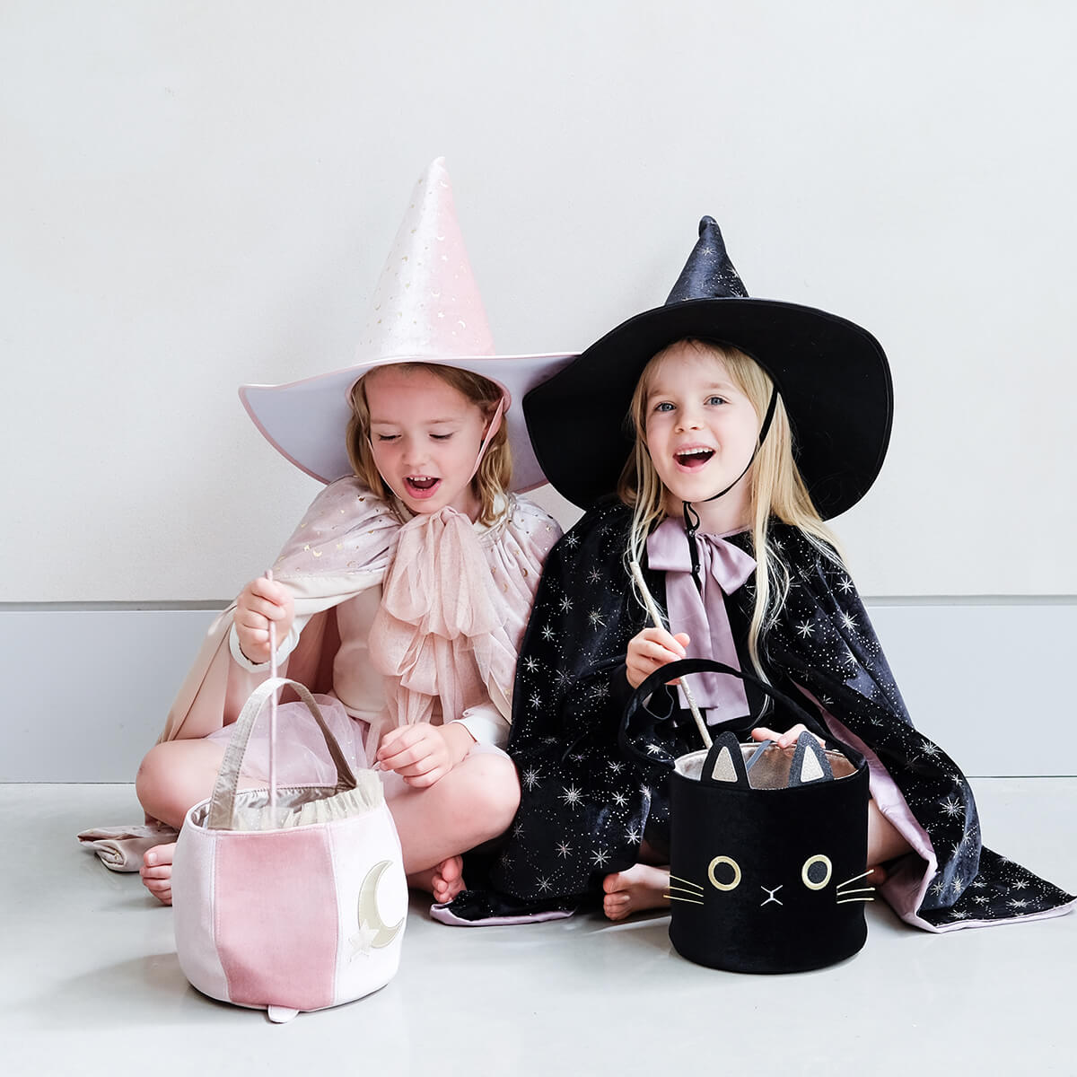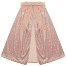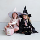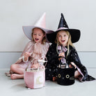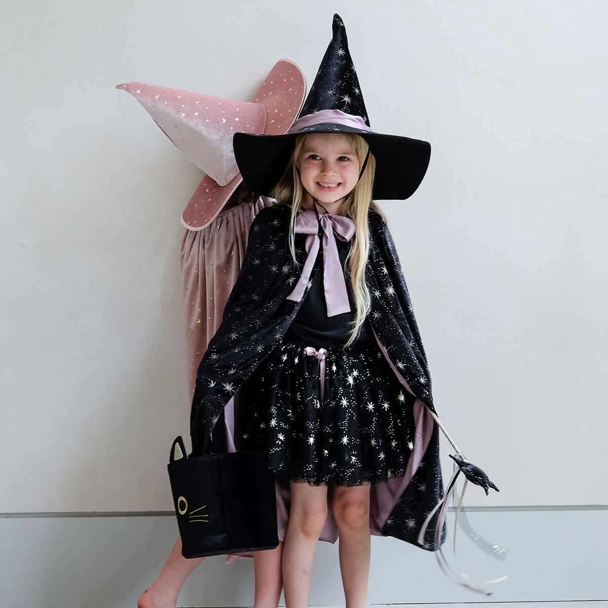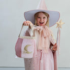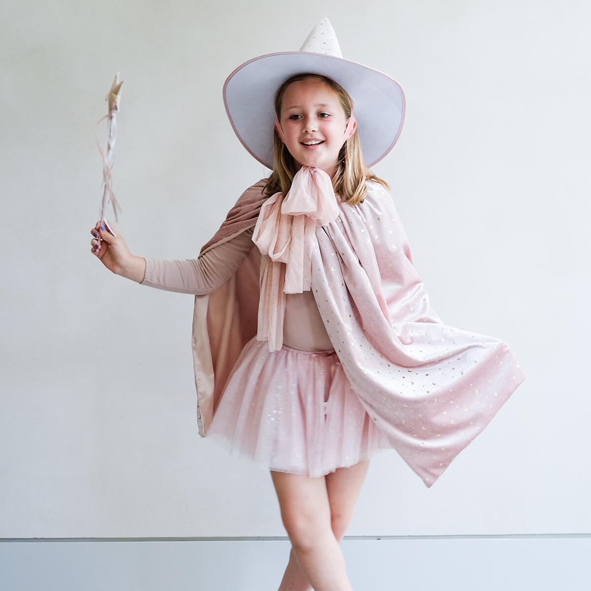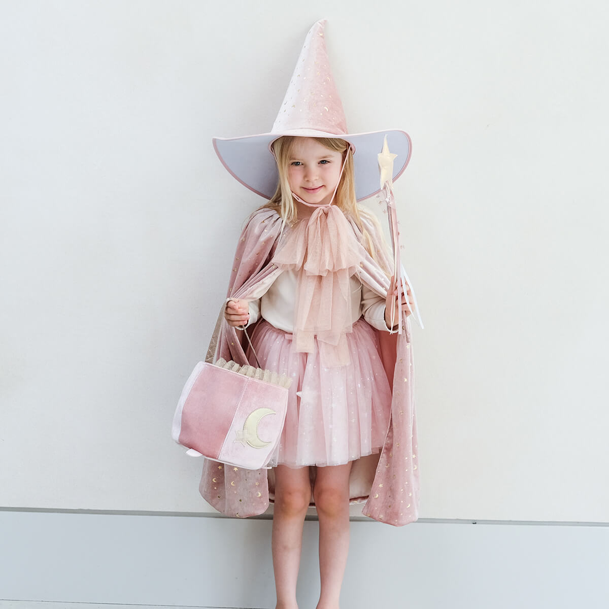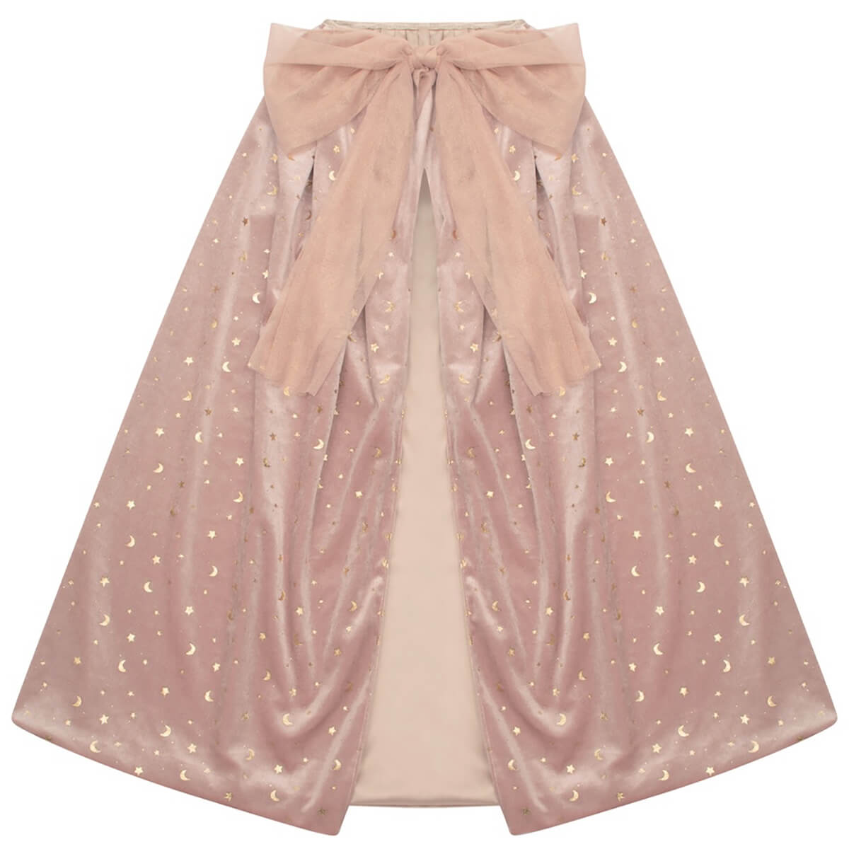 Glinda Bow Witch Cape by Mimi & Lula. A super soft velvet cape in the prettiest shade of pink. Super soft pink velvet embellished with a gold moon and star print featuring a soft tulle oversized bow and satin lining.