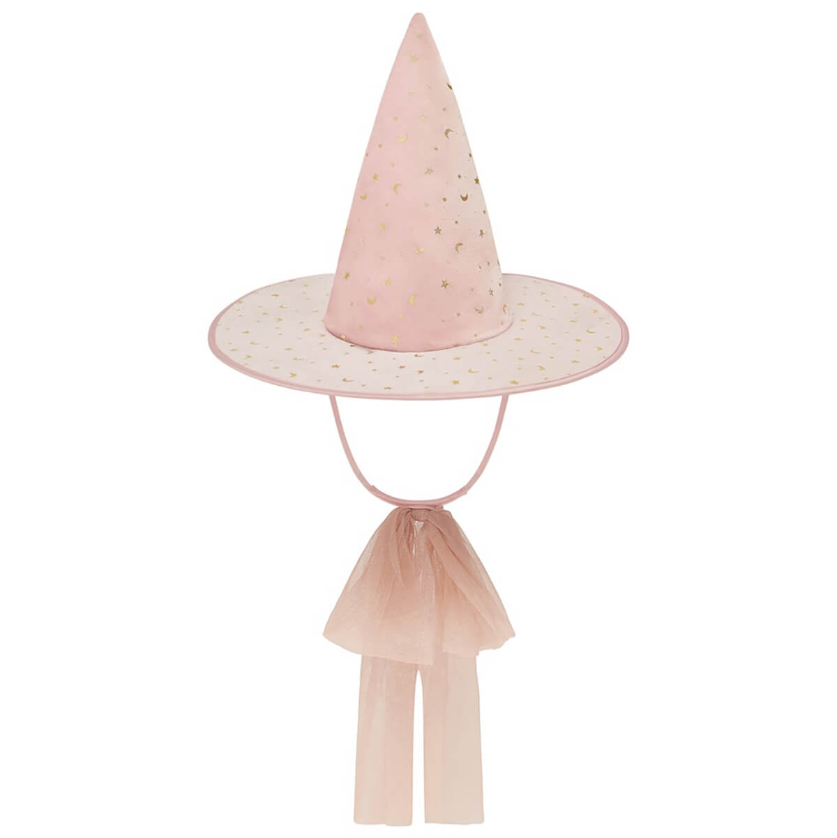 Glinda Bow Witch Hat by Mimi & Lula. A super soft velvet hat in the prettiest shade of pink. Super soft pink velvet embellished with a gold moon and star print featuring a soft tulle oversized bow.