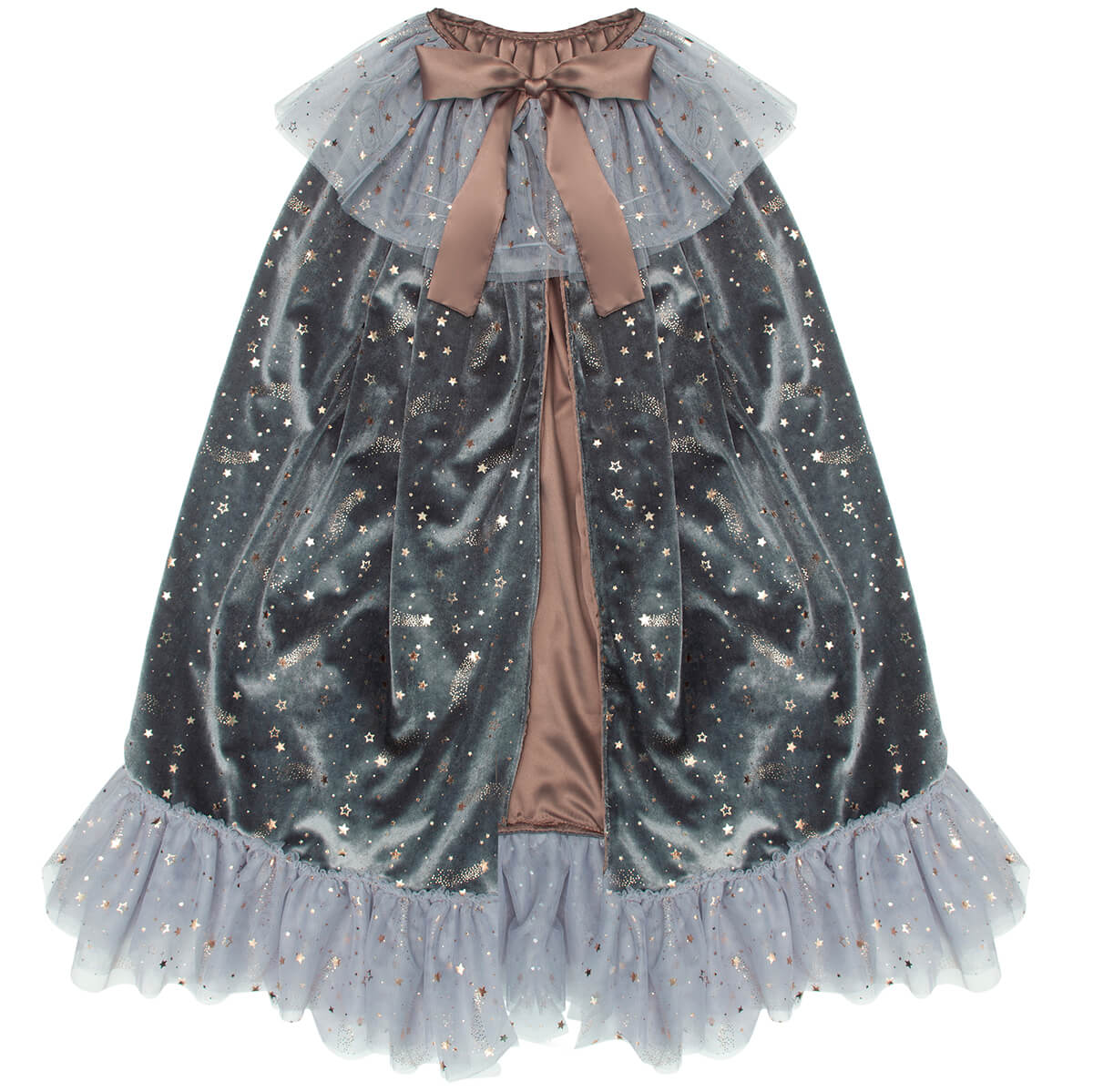 Super soft grey velvet embellished with constellations of rose gold stars, featuring a tulle collar and skirt plus super soft satin bow and lining.