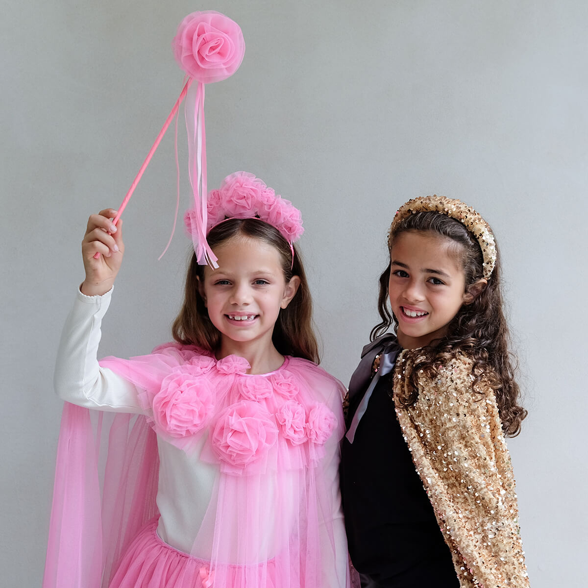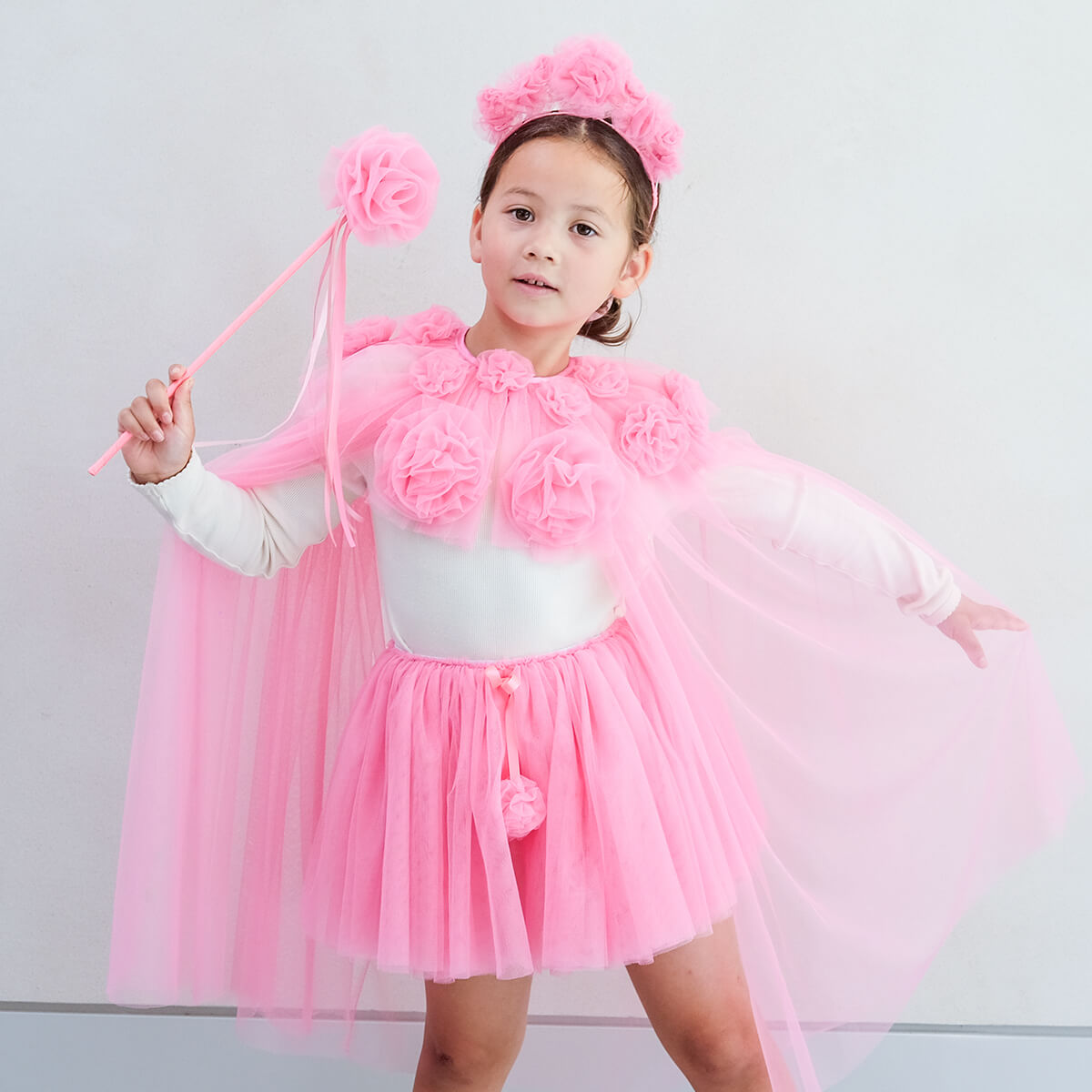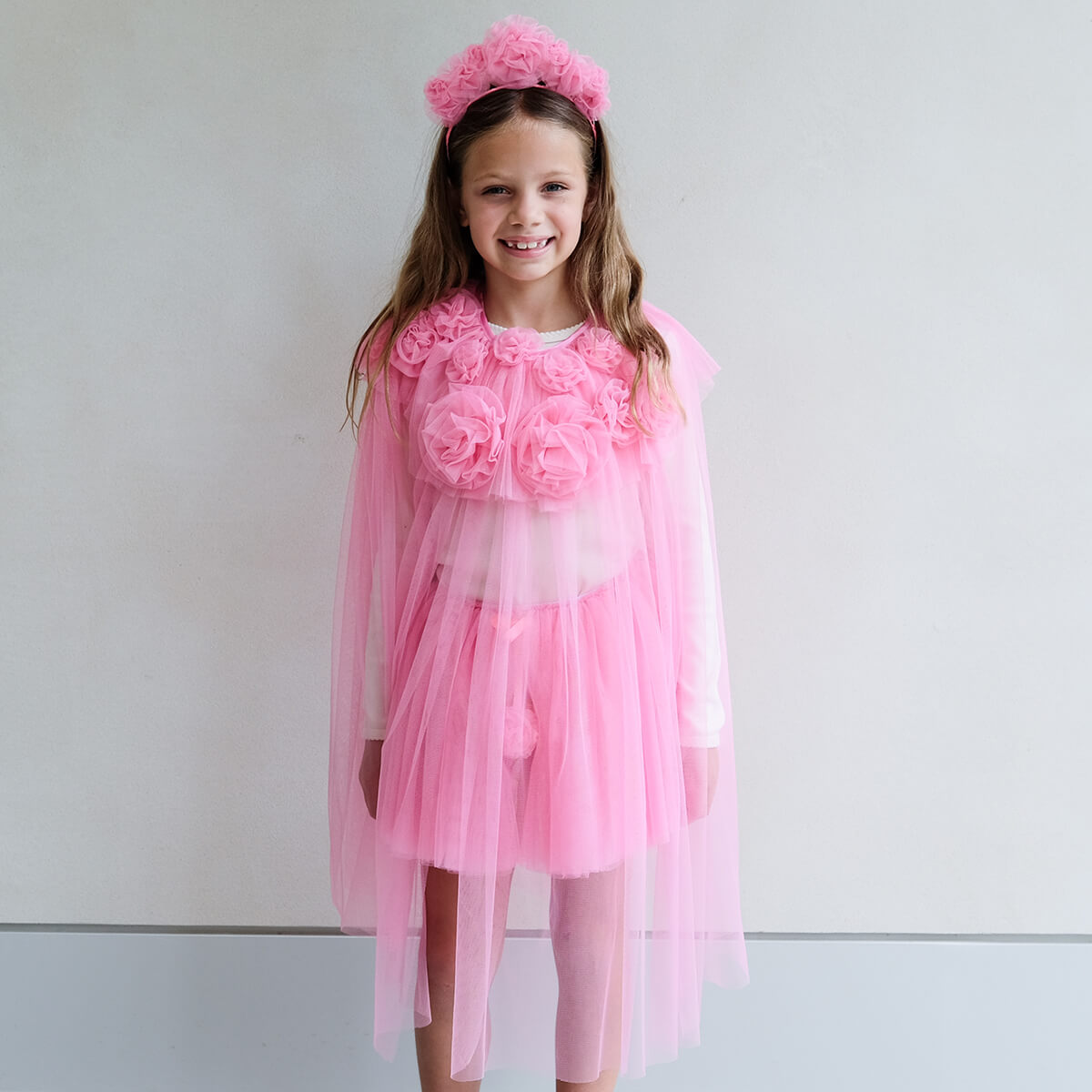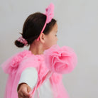 Crafted from layers of soft pink tulle measuring approx 76cm in length. Popper button closure with satin ribbon tie and pink tulle ruffle pom poms