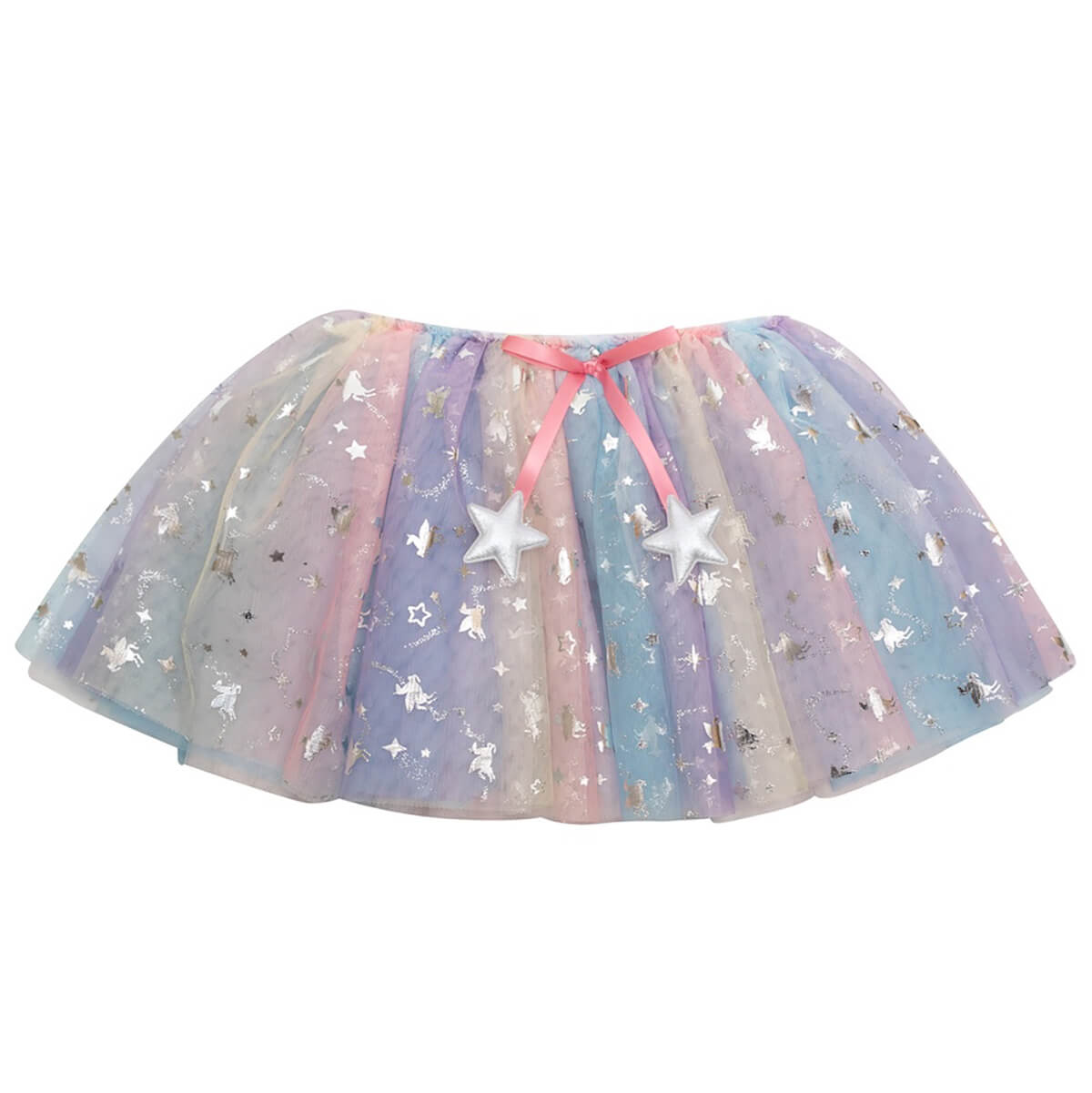 Layers of pastel coloured rainbow tulle embellished with metallic silver unicorns and stars.