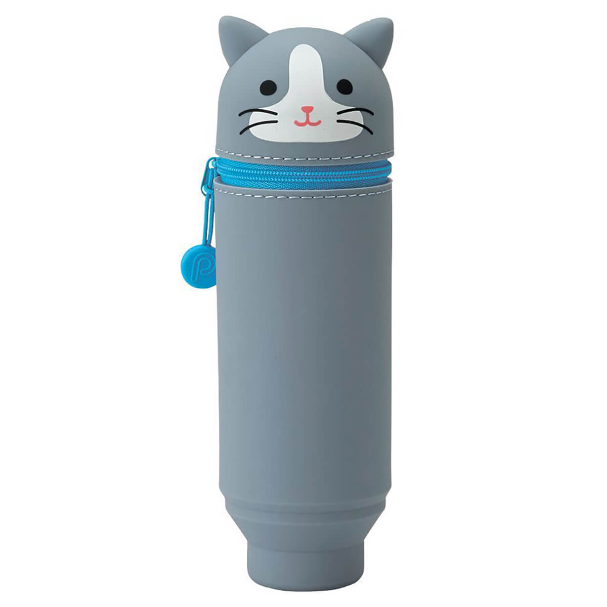 Grey Tuxedo Cat PuniLabo Stand Pen Case by Lihit Lab. In soft touch silicone with a brightly coloured zipper fastening, this super cute kitty pen case can be easily transformed into a pen stand by pushing down the bottom. A total of 10 standard-sized pens fit in the pencil case. An eraser holder is hidden in the lid of the case. Made from a tactile, suede-feel silicone for a luxurious touch.