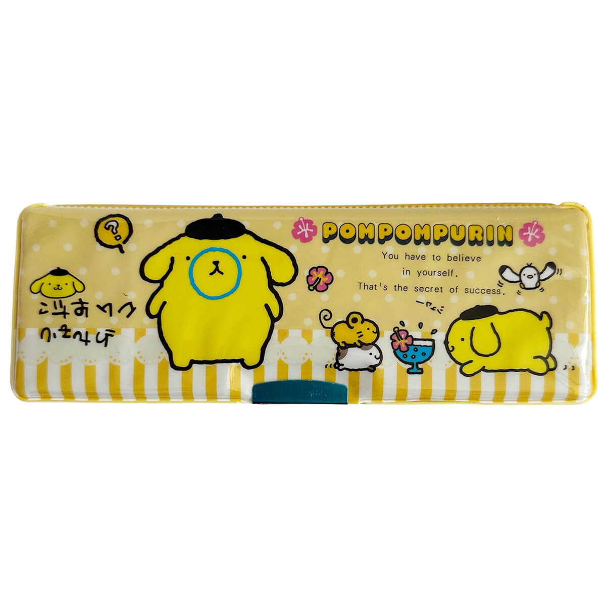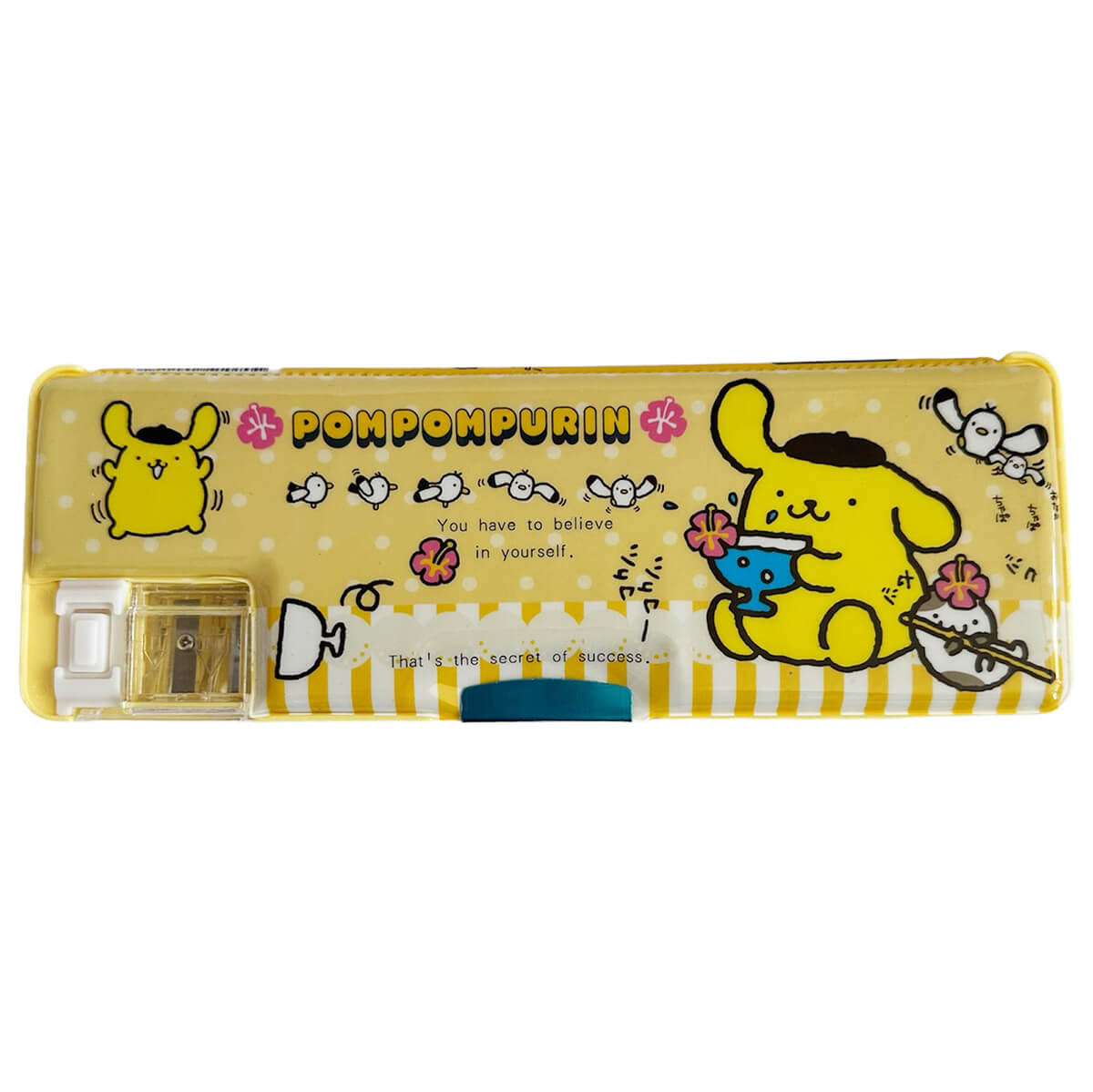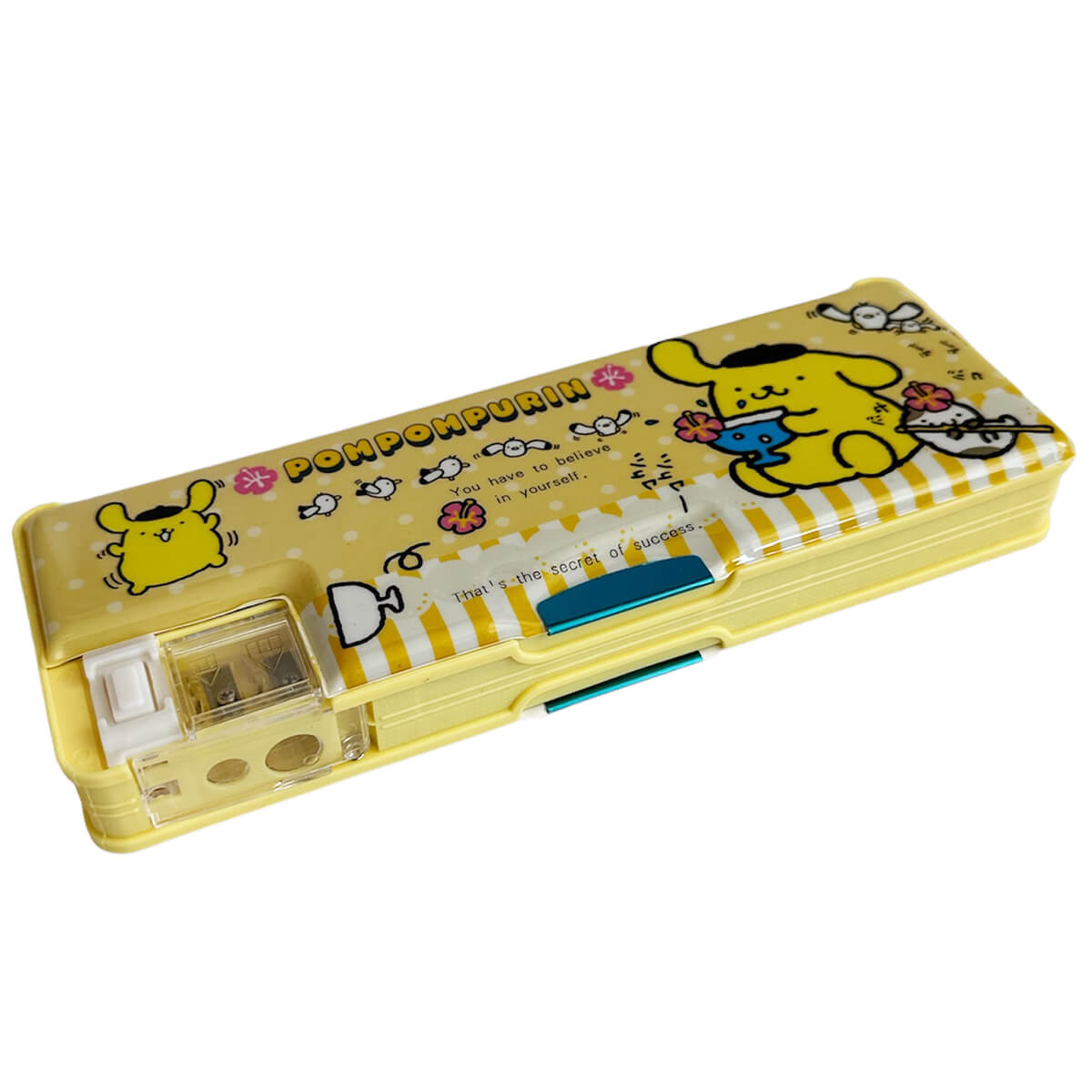 Pompompurin retro 80s style vinyl pencil case by Sanrio. This fun double-sided magnetic pencil case has space on each side for storing pencil and colouring crayons. Features slots to hold pencils in place, and a small times table embossed in the bottom section. Magnetic closure both sides with a fun button-release door on the built-in dual pencil sharpener.