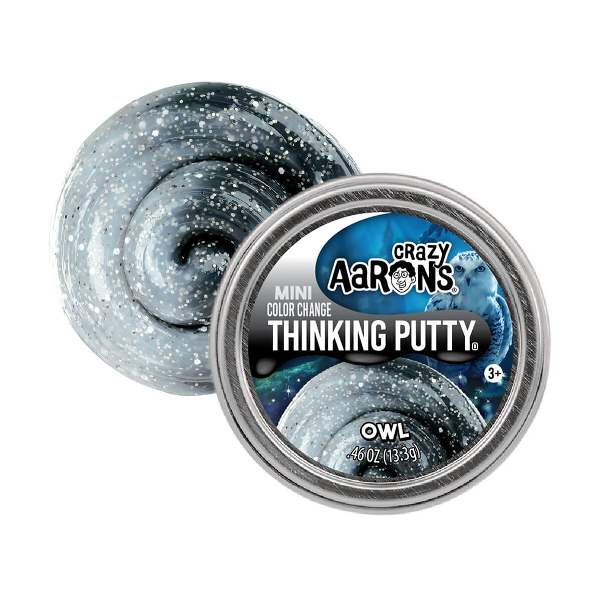 Owl Mini Thinking Putty by Crazy Aarons. Take flight with Crazy Aaron's® Mini Owl Thinking Putty®! Inspired by the majestic snowy owl, this magical putty sparkles with silver sequins and shifts from deep black to white as you play, mimicking the owl’s stunning feathers. Watch it change color with the warmth of your hands and soar into hours of fidgeting fun!