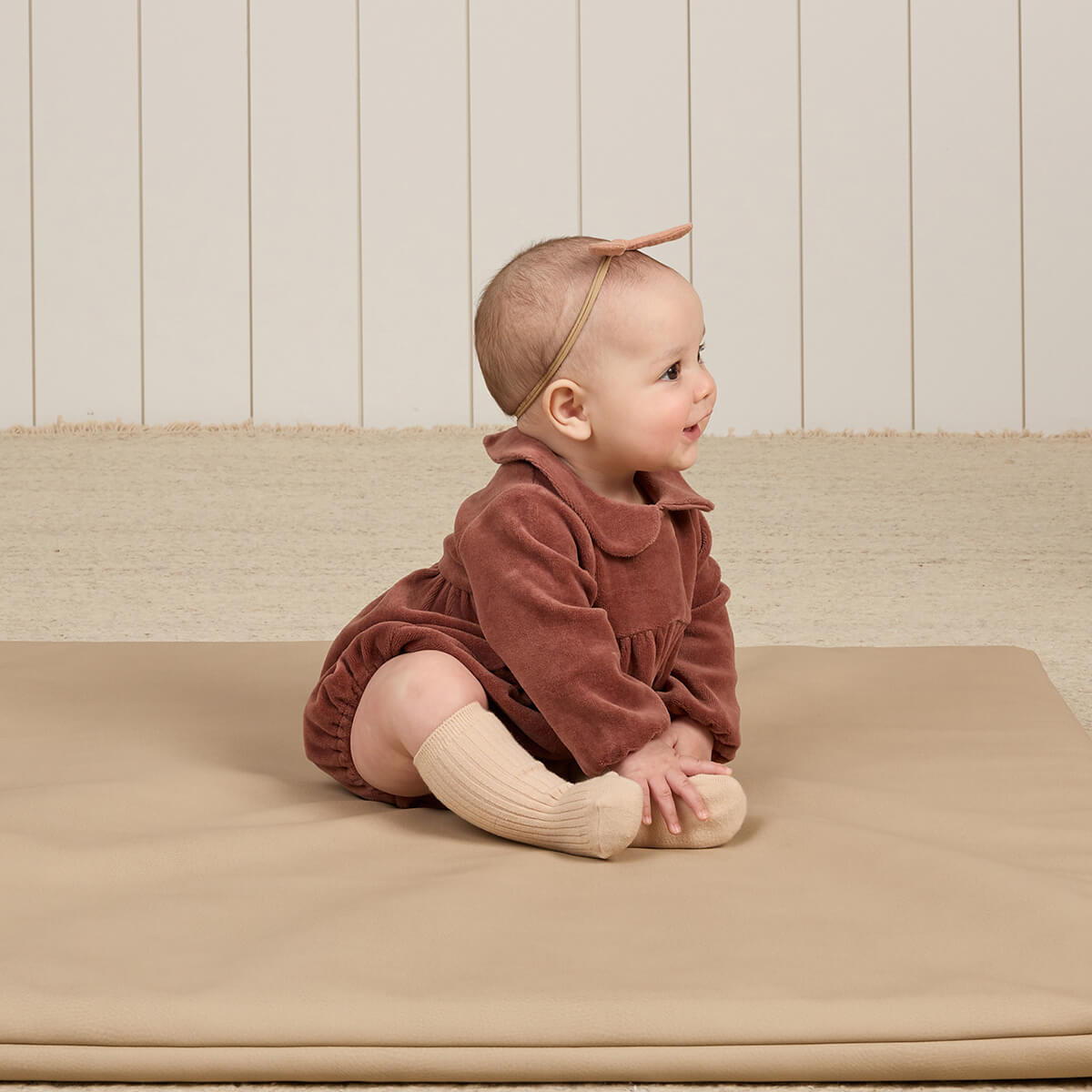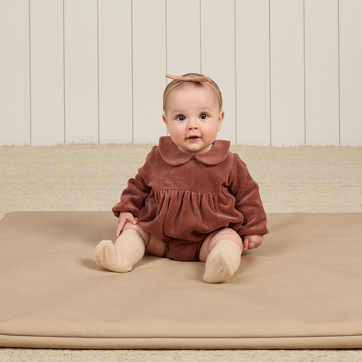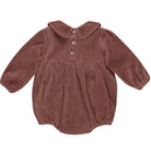 Peter Pan romper by Quincy Mae. A soft baby romper with long sleeves and cute peter pan collar along the neck. Also has snap buttons along the bottom for easy changing.