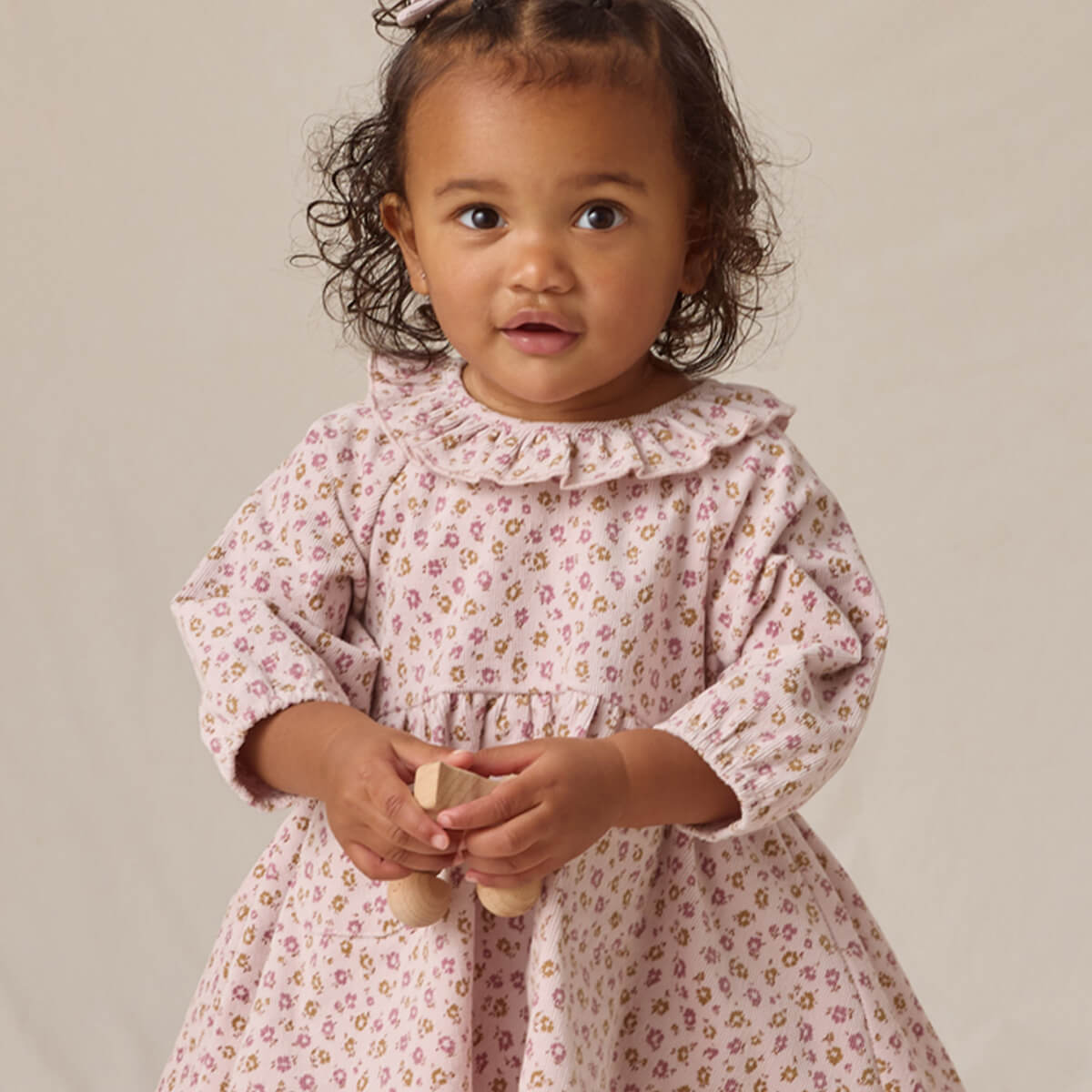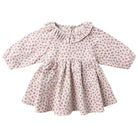 Simone Dress by Quincy Mae. The sweet simone dress features long sleeves, a curved waistline, front patch pockets, and a darling collar. A zipper at the back allows for easy dressing—perfect for everyday charm and comfort. Coordinating bloomers included with all sizes.