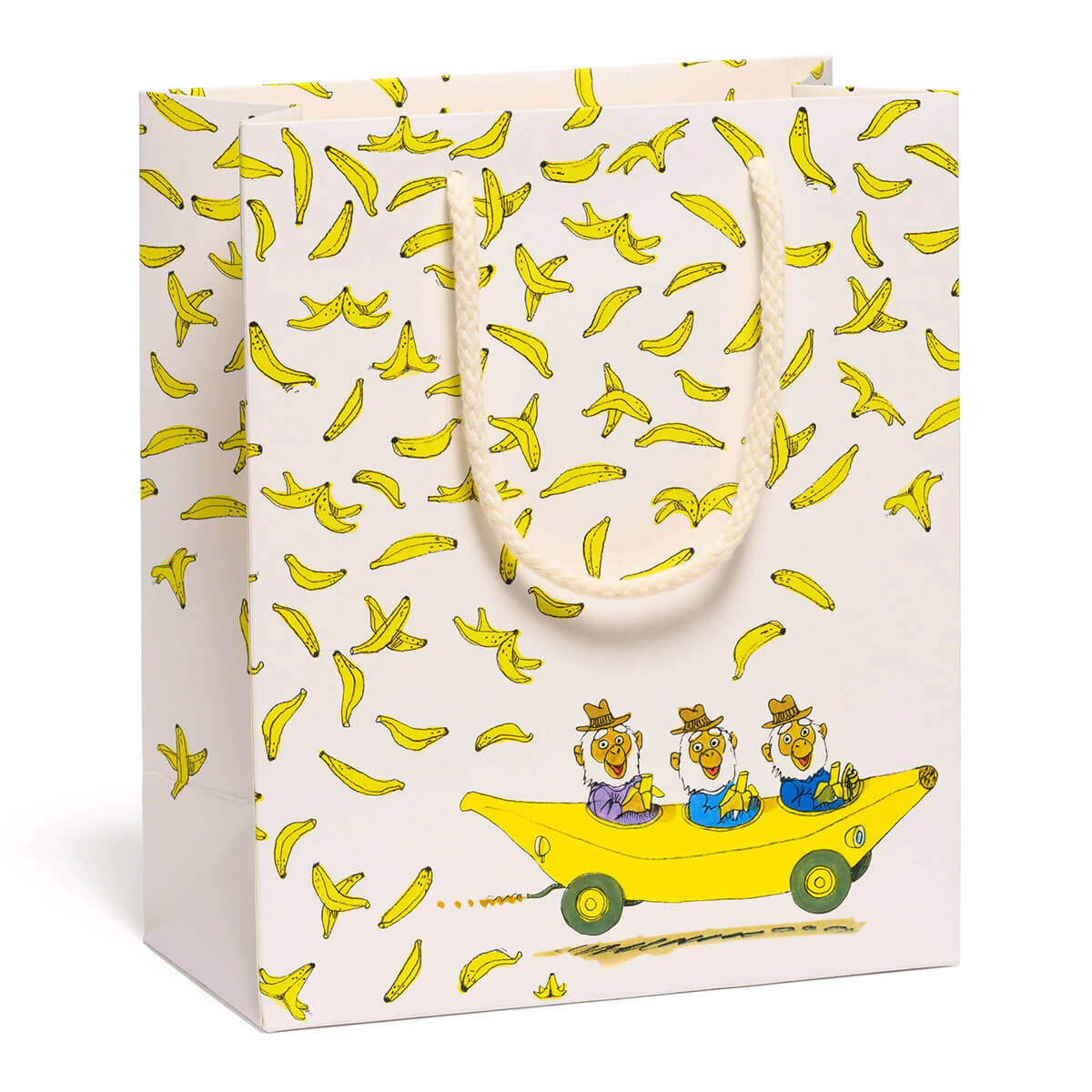 Bananas Gorilla medium gift bag by Red Cap Cards. Features an illustration by Richard Scarry. Made from heavyweight coated paper and finished with a cotton rope handle. The perfect gift bag for a small gift. Easily fits in an item of clothing, medium toy, book or similar gift.