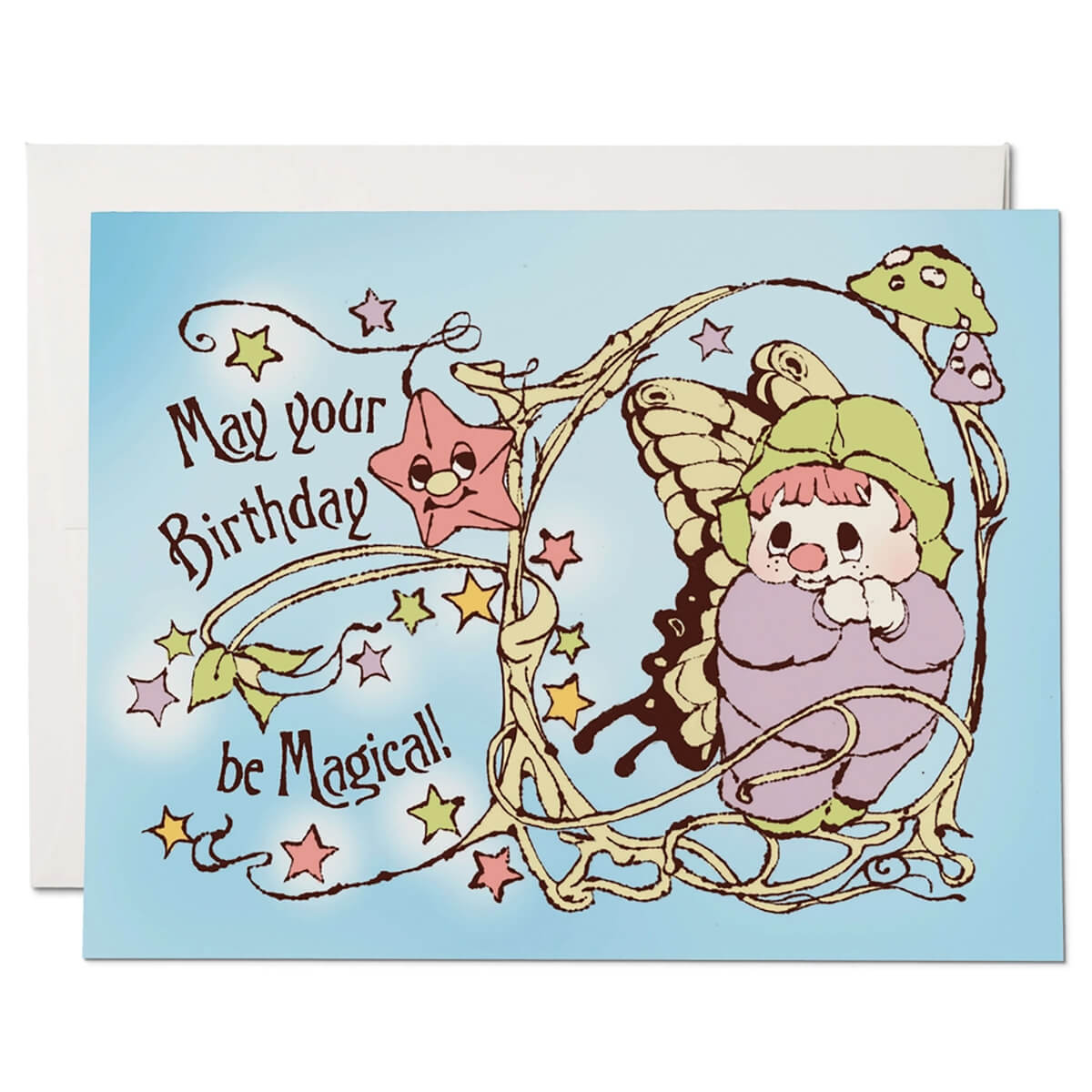 Magical Birthday Wishes greetings card by Red Cap Cards. Features an illustration by Hannah-Michelle Bayley. Printed in the USA on heavyweight card stock. Blank inside with white envelope.