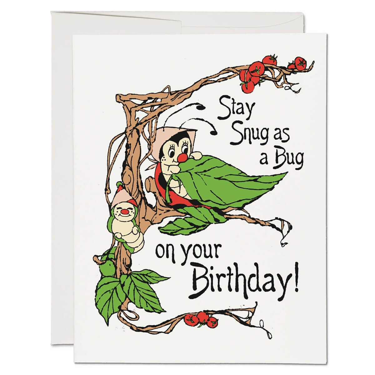Stay Snug Birthday greetings card by Red Cap Cards. Features an illustration by Hannah-Michelle Bayley. Printed in the USA on heavyweight card stock. Blank inside with white envelope.