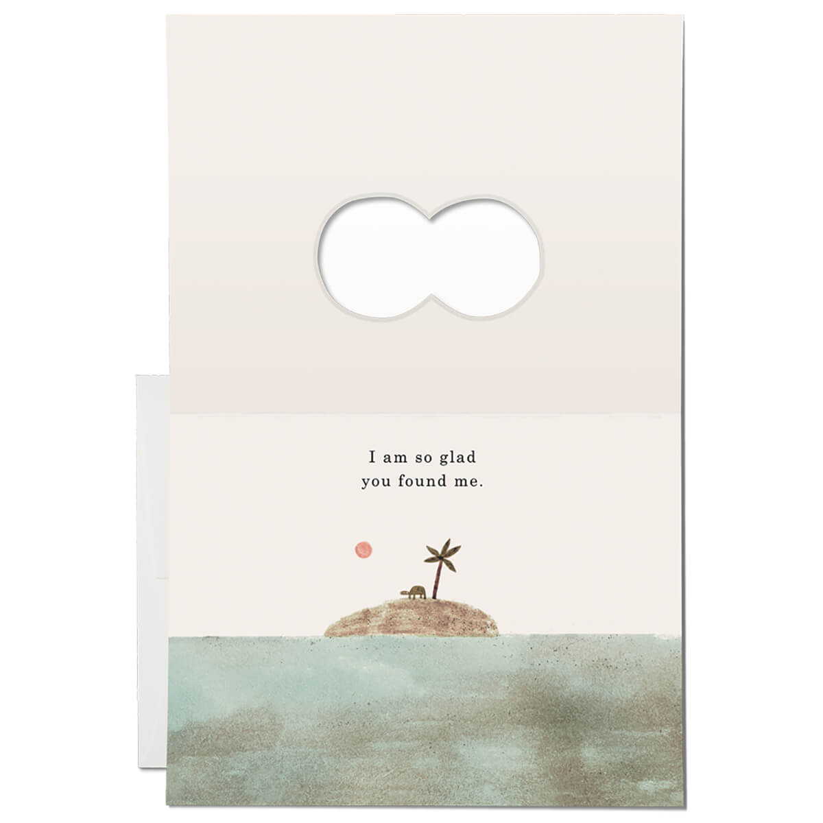 Turtle island love greetings cards by Red Cap Cards. Features an illustration by Jon Klassen. Printed in the USA on heavyweight card stock. Small illustration inside with 'I am so glad you found me' white envelope.