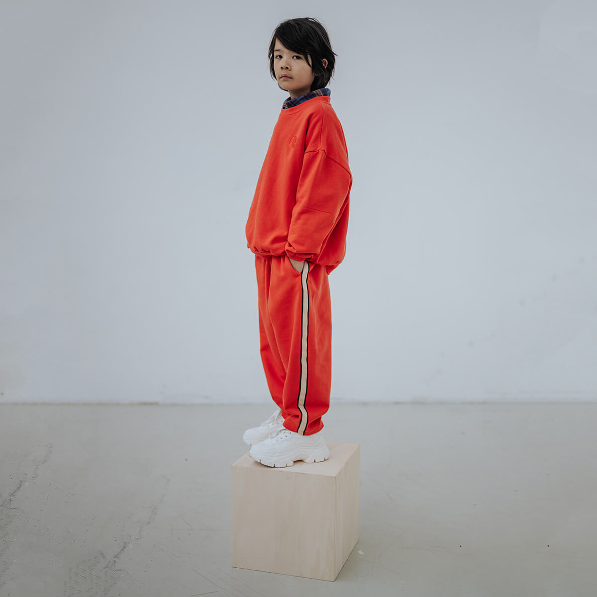 Ease Pant by Repose AMS. Loose fit round leg sweatpants in vivid red cotton with a contrast stripe.