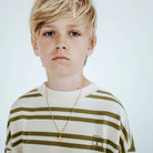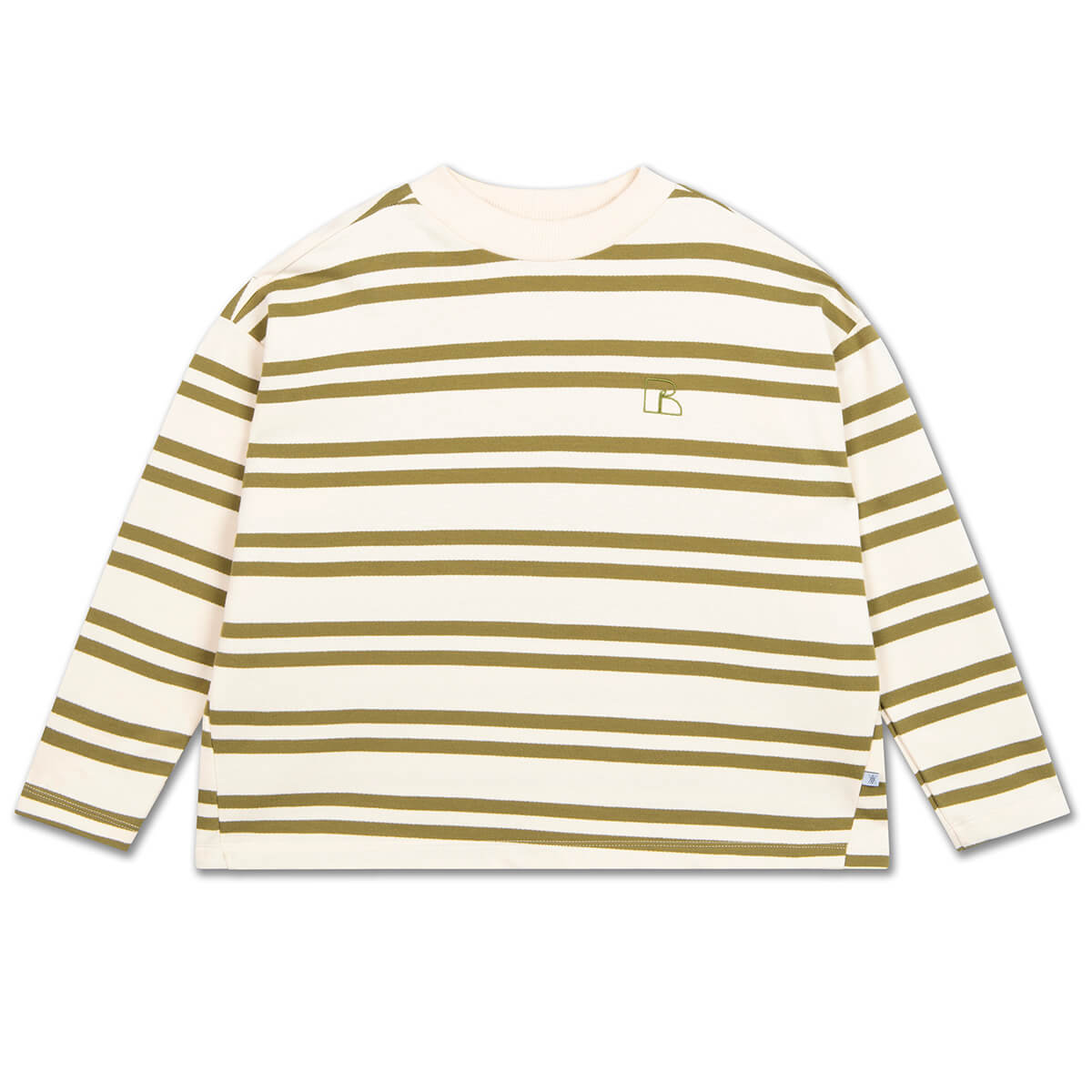 Oversized Boxy Sweater by Repose AMS. The oversized boxy sweater in green moss stripe is crafted from yarn dyed organic cotton. Shaped in a boxy fit, it features dropped shoulders, an embroidered logo on the chest and a round, ribbed neck. A woven brand tag on the side seam completes the design. Yarn-dyed fabric is made by dyeing the threads before weaving, creating a rich, lasting color and subtle texture.