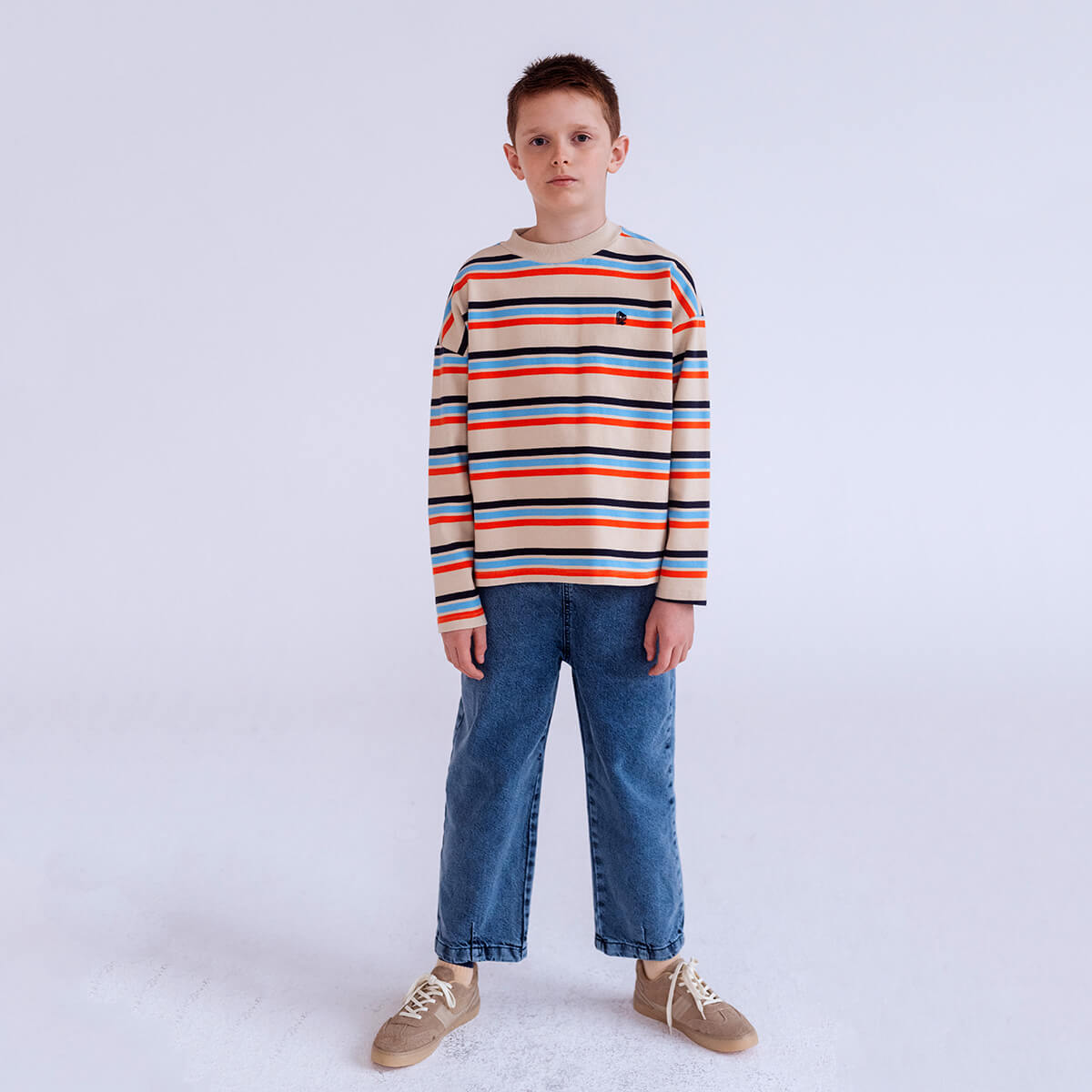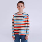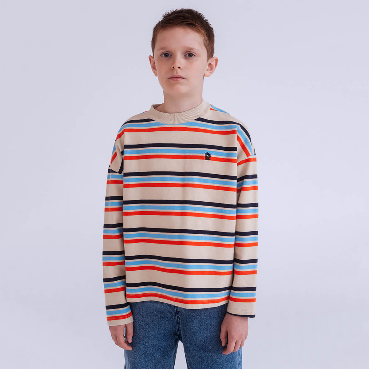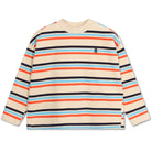 Oversized Boxy Sweater by Repose AMS.The oversized boxy sweater in multi crème brûlée stripe is crafted from interlock yarn-dyed organic cotton with a hint of stretch for extra comfort. Shaped in a boxy fit, featuring dropped shoulders, an embroidered logo on the chest and ribbed neck, cuffs and hem. A woven brand tag in the side seam completes the design. The organic cotton interlock is designed to withstand frequent wear and washing while maintaining its shape and quality.