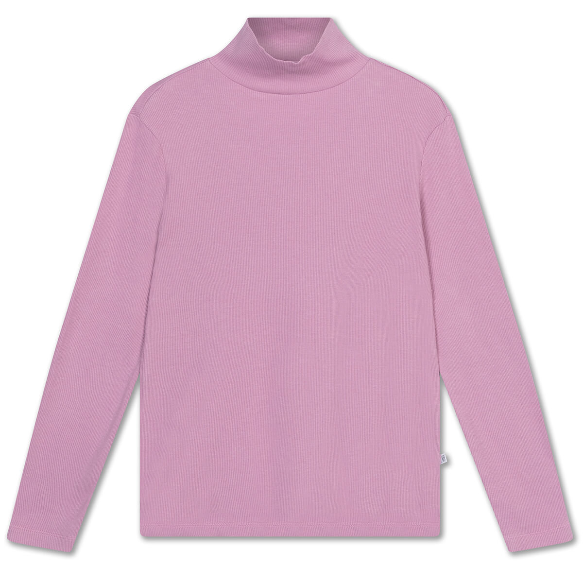 Turtleneck by Repose AMS. The turtle neck tee in orchid mauve is crafted from soft organic cotton ribbed jersey. It is designed for a snug and comfy fit and features long sleeves and a high neck, making it a perfect layering piece while also great for wearing alone.